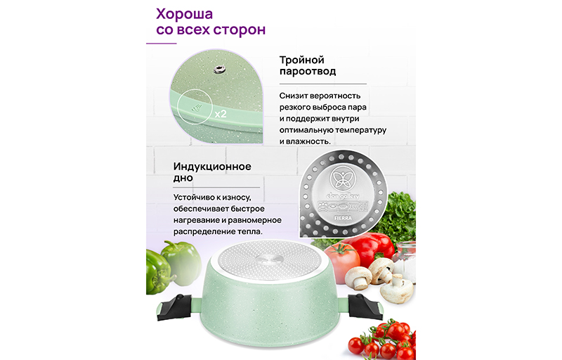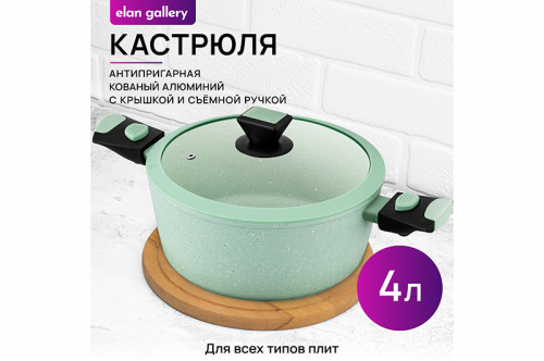 Кастрюля «Зелёный мрамор» из серии Fierra имеет размер 40х25,5х17 см, объём – 4 литра. Высота без крышки – 10,5 см, диаметр дна – 20 см, диаметр индукционного дна – 18 см. Изготовлена из кованого алюминия, имеет ультрапрочное антипригарное покрытие PFLUON COOКMARK. Оно устойчиво к износу и царапинам, не содержит PFOA и другие вредные вещества. Изделие равномерно нагревается и распределяет тепло, благодаря чему продукты к нём надолго сохраняют аромат, сочность и полезные свойства. Ручки из бакелита легко снимаются, без них ёмкость легко поместится в холодильник и в духовку. Покрытие Soft touch обеспечивает дополнительный комфорт при переноске. Прозрачная стеклянная крышка с тремя пароотводами позволит вам следить за степенью готовности блюд, а большая пластиковая ручка обеспечит удобство снятия. После мытья поверхность изделия моментально высыхает, и вам не придётся вытирать его или долго сушить. Жаропрочная алюминиевая кастрюля поможет в приготовлении вкусных блюд дома. Используйте её для варки супов, плова и овощей, приготовьте на завтрак кашу. Благодаря лёгкому весу удобна для повседневного использования. Эксплуатация: не нагревайте без продуктов. Ставьте посуду строго по центру источника тепла. Не используйте металлические принадлежности, пользуйтесь силиконовыми и деревянными лопатками. Без крышки и ручки подходит для запекания в духовом шкафу при температуре до 230 градусов. Не используйте съёмную ручку, чтобы достать раскалённую сковородку из духовки. Подходит для всех типов плит, включая индукцию. Не используйте абразивные и щелочные средства. Подходит для использования в посудомоечной машине в режиме «Эко». Красивый ковш станет отличным подарком любой хозяйке. Пополните свой кухонный инвентарь и привнесите удовольствие в процесс приготовления пищи!