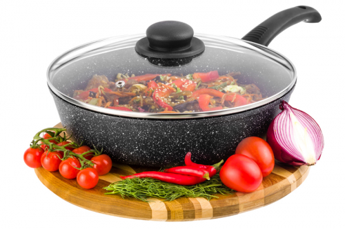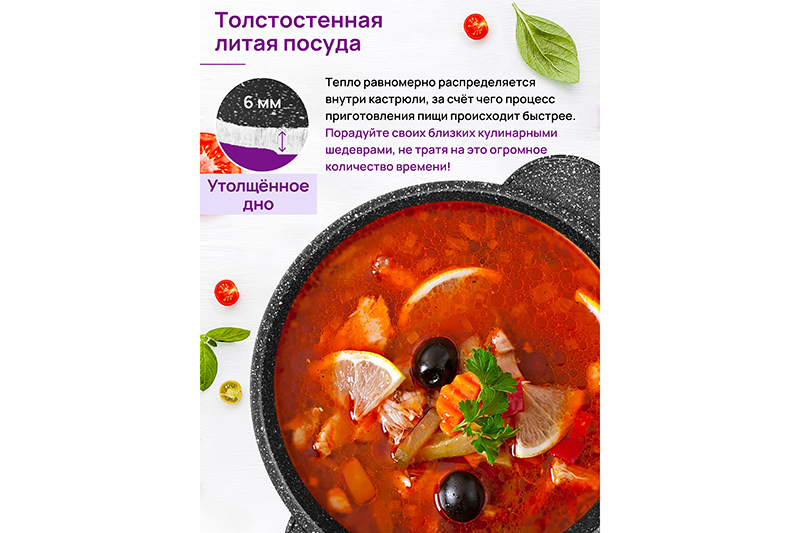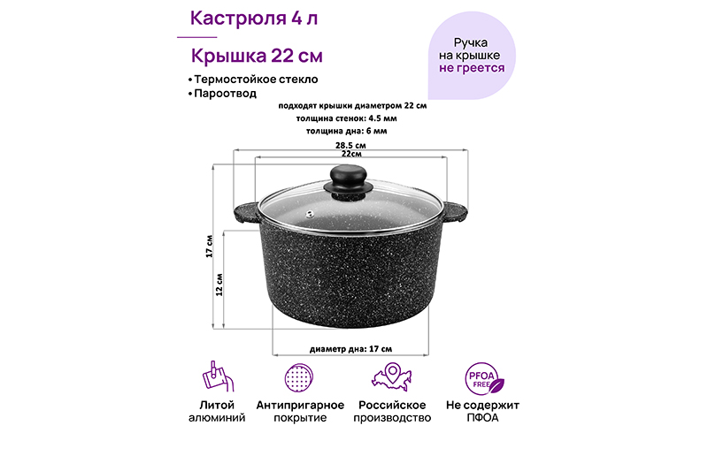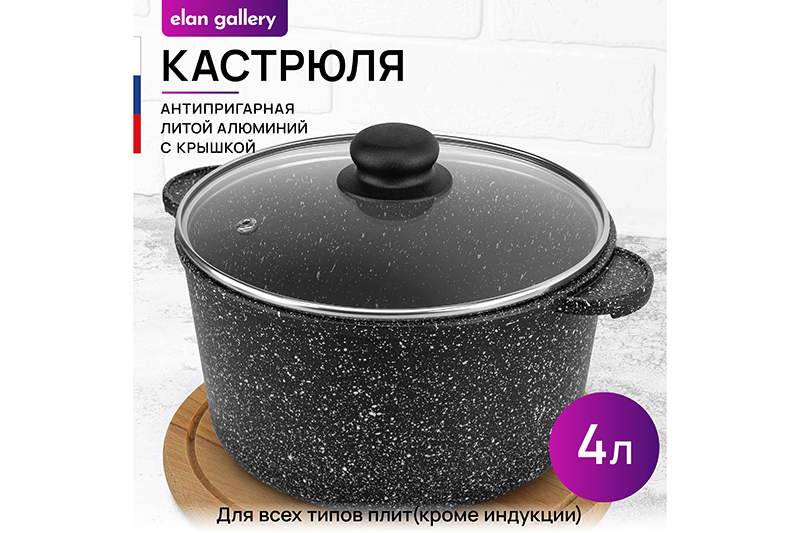 Кастрюля Elan Gallery "Чёрный мрамор" из серии "Гармония вкуса" объёмом 4 литра с крышкой равномерно разогревается и распределяет тепло таким образом, что продукты в ней остаются сочными и сохраняют все полезные свойства и аромат. Диаметр стеклянной крышки – 22 см, диаметр дна – 17 см. Кастрюля с прозрачной крышкой выполнена из толстостенного литого алюминия и имеет ультрапрочное двухслойное антипригарное покрытие Cookmark. Покрытие устойчиво к царапинам и износу, полностью безопасно для здоровья и не содержит PFOA или других вредных веществ. Крышка изготовлена из жаропрочного стекла и имеет пароотвод. Алюминиевая кастрюлька с толстыми дном и стенками выполнена в стильном дизайне и позволит приготовить дома суп, кашу, плов или любой гарнир. Порадуйте близких супом с фрикадельками, борщом или куриной лапшой. Удобна для приготовления пасты, так как макаронные изделия не будут прилипать на дно благодаря антипригарной поверхности. Суповая кастрюля подойдёт для тушения и варки блюд из мяса, рыбы и овощей. Эксплуатация: кухонную утварь не нагревать без продуктов. Дайте посуде остыть, прежде чем помещать ее в воду. Использовать только деревянные и силиконовые приборы. Не мыть абразивными или щелочными моющими средствами. Использовать в ПММ только в режиме "Эко" с применением средств, не содержащих щелочи. Подходит для стеклокерамических, газовых и электрических плит. Не подходит для индукционных плит! Без крышки можно использовать в духовой печи при температуре до 250 градусов. Теперь для использования в духовке не понадобится отдельная ёмкость. Кастрюля станет идеальным подарком для женщин на 8 Марта или День Рождения и придаст процессу приготовления пищи новый уровень комфорта. Подарите такую универсальную вещь маме, подруге, сестре или бабушке. Красивая кастрюля – мечта любой хозяйки! В серии "Гармония вкуса" вы найдёте любой кухонный инвентарь: сковороды, кастрюли, блинницы, казаны и жаровни. Соберите набор для вашей кухни или столовой в едином стиле!