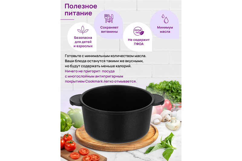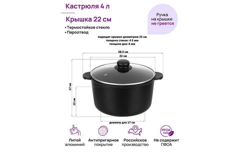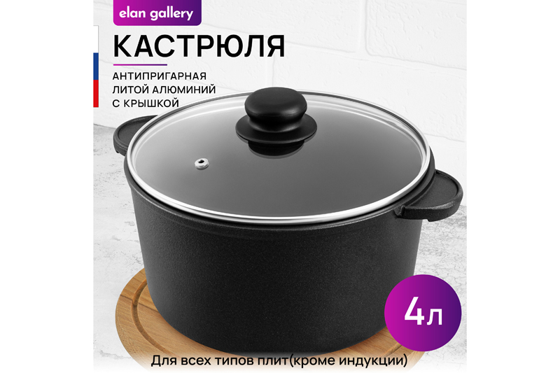 Кастрюля Elan Gallery "Чёрный оникс" из серии "Гармония вкуса" объёмом 4 литра с крышкой равномерно разогревается и распределяет тепло таким образом, что продукты в ней остаются сочными и сохраняют все полезные свойства и аромат. Диаметр стеклянной крышки – 22 см, диаметр дна – 17 см. Кастрюля с прозрачной крышкой выполнена из толстостенного литого алюминия и имеет ультрапрочное двухслойное антипригарное покрытие Cookmark. Покрытие устойчиво к царапинам и износу, полностью безопасно для здоровья и не содержит PFOA или других вредных веществ. Крышка изготовлена из жаропрочного стекла и имеет пароотвод. Алюминиевая кастрюлька с толстыми дном и стенками выполнена в стильном дизайне и позволит приготовить дома суп, кашу, плов или любой гарнир. Порадуйте близких супом с фрикадельками, борщом или куриной лапшой. Удобна для приготовления пасты, так как макаронные изделия не будут прилипать на дно благодаря антипригарной поверхности. Суповая кастрюля подойдёт для тушения и варки блюд из мяса, рыбы и овощей. Эксплуатация: кухонную утварь не нагревать без продуктов. Дайте посуде остыть, прежде чем помещать ее в воду. Использовать только деревянные и силиконовые приборы. Не мыть абразивными или щелочными моющими средствами. Использовать в ПММ только в режиме "Эко" с применением средств, не содержащих щелочи. Подходит для стеклокерамических, газовых и электрических плит. Не подходит для индукционных плит! Без крышки можно использовать в духовой печи при температуре до 250 градусов. Теперь для использования в духовке не понадобится отдельная ёмкость. Кастрюля станет идеальным подарком для женщин на 8 Марта или День Рождения и придаст процессу приготовления пищи новый уровень комфорта. Подарите такую универсальную вещь маме, подруге, сестре или бабушке. Красивая кастрюля – мечта любой хозяйки! В серии "Гармония вкуса" вы найдёте любой кухонный инвентарь: сковороды, кастрюли, блинницы, казаны и жаровни. Соберите набор для вашей кухни или столовой в едином стиле!