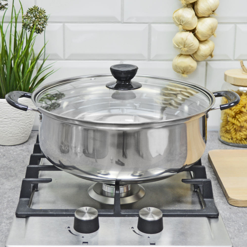 Кастрюля 5,5л нерж Promo с крышкой из жаропрочного стеклаКлассическая кастрюля с прозрачной стеклянной крышкой впишется в любой интерьер кухни.Кастрюля выполнена из высококачественной нержавеющей стали.На внутренней поверхности кастрюли расположена мерная шкала.В комплекте стеклянная крышка.Подходит для всех типов плит, в том числе индукционных.Характеристики:Диаметр - 38 смВысота - 30 смОбъем - 10 лЗаключаем договора по 44 ФЗ, 223 ФЗ
