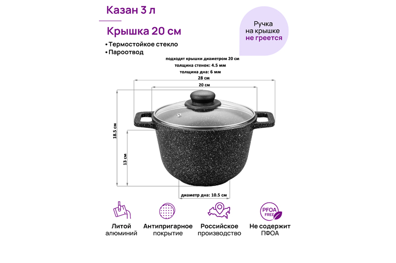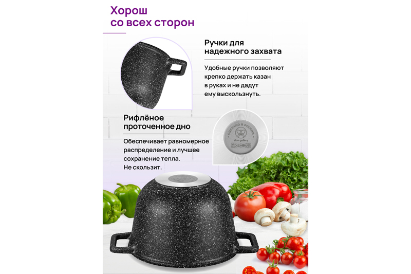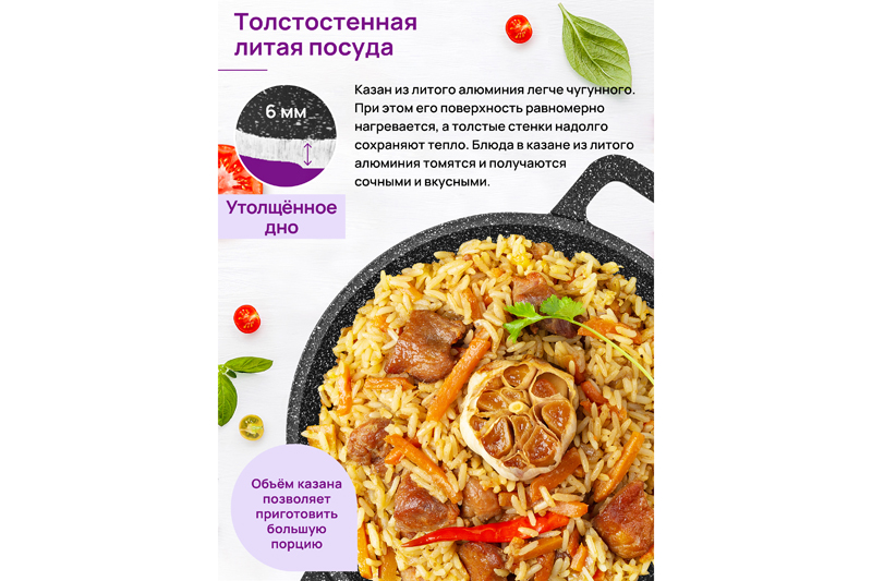 Казан "Гармония вкуса" объемом 3 литра с крышкой равномерно разогревается и распределяет тепло таким образом, что продукты в нем остаются сочными и сохраняют все свои полезные и вкусовые свойства. Казан выполнен из толстостенного литого алюминия и имеет ультрапрочное двухслойное антипригарное покрытие Cookmark. Покрытие устойчиво к царапинам и износу, полностью безопасно для здоровья и не содержит PFOA или других вредных веществ. Эксплуатация: не нагревать без продуктов. Дайте посуде остыть, прежде чем помещать ее в воду. Использовать только деревянные и силиконовые приборы. Не мыть абразивными или щелочными моющими средствами. Использовать в посудомоечной машине только в режиме "Эко". Подходит для всех типов плит, кроме индукционных. Можно использовать в духовом шкафу без крышки при температуре до 250 градусов.