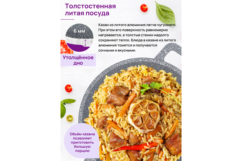 Казан "Гармония вкуса" объемом 3 литра с крышкой равномерно разогревается и распределяет тепло таким образом, что продукты в нем остаются сочными и сохраняют все свои полезные и вкусовые свойства. Казан выполнен из толстостенного литого алюминия и имеет ультрапрочное двухслойное антипригарное покрытие Cookmark. Покрытие устойчиво к царапинам и износу, полностью безопасно для здоровья и не содержит PFOA или других вредных веществ. Эксплуатация: не нагревать без продуктов. Дайте посуде остыть, прежде чем помещать ее в воду. Использовать только деревянные и силиконовые приборы. Не мыть абразивными или щелочными моющими средствами. Использовать в посудомоечной машине только в режиме "Эко". Подходит для всех типов плит, кроме индукционных. Можно использовать в духовом шкафу без крышки при температуре до 250 градусов.