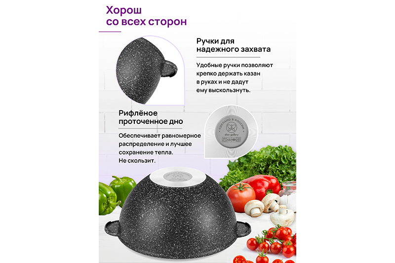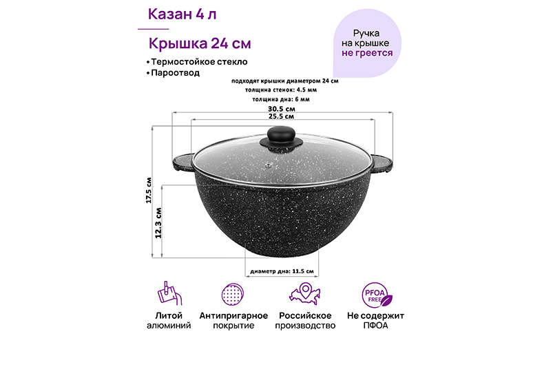 Казан "Гармония вкуса" объемом 4 литра с крышкой равномерно разогревается и распределяет тепло таким образом, что продукты в нем остаются сочными и сохраняют все свои полезные и вкусовые свойства. Казан выполнен из толстостенного литого алюминия и имеет ультрапрочное двухслойное антипригарное покрытие Cookmark. Покрытие устойчиво к царапинам и износу, полностью безопасно для здоровья и не содержит PFOA или других вредных веществ. Эксплуатация: не нагревать без продуктов. Дайте посуде остыть, прежде чем помещать ее в воду. Использовать только деревянные и силиконовые приборы. Не мыть абразивными или щелочными моющими средствами. Использовать в посудомоечной машине только в режиме "Эко". Подходит для всех типов плит, кроме индукционных. Можно использовать в духовом шкафу без крышки при температуре до 250 градусов.
