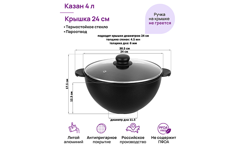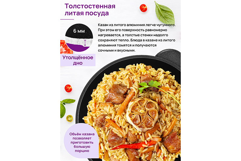 Казан "Гармония вкуса" объемом 4 литра с крышкой идеально подходит для плова, рагу и других блюд. Внутри стенки закругленные. Казан можно использовать как кастрюлю или сковороду - вок. Выполнен из литого алюминия и имеет многослойное антипригарное покрытие Cookmark. Покрытие имеет декоративный каменный узор, напоминающий гранитную или мраморную крошку. У алюминиевого казана толстые стенки 4,5 мм, утолщенное дно 6 мм и стеклянная жаропрочная крышка с ненагревающейся ручкой из жаропрочного пластика. Снизу имеет плоское дно и подходит для газовой, электрической или стеклокерамической плиты. Не для индукции. Устойчив к воздействию открытого огня. При использовании на мангале или костре может образоваться нагар: не сказывается на функциональности. Подходит для приготовления в духовом шкафу или печи без крышки при температуре до 250 градусов. Можно мыть в ПММ только в режиме "Эко". Не мыть абразивными или щелочными средствами. Использовать только деревянные или силиконовые лопатки.