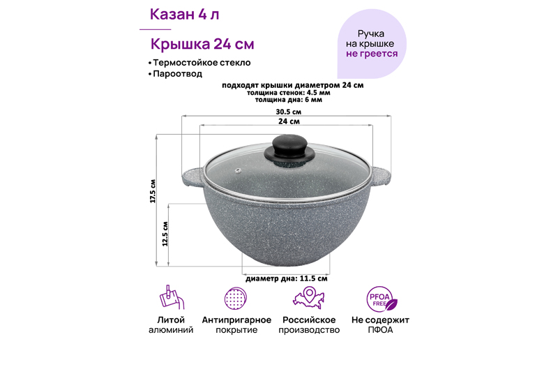 Казан "Гармония вкуса" объемом 4 литра с крышкой равномерно разогревается и распределяет тепло таким образом, что продукты в нем остаются сочными и сохраняют все свои полезные и вкусовые свойства. Казан выполнен из толстостенного литого алюминия и имеет ультрапрочное двухслойное антипригарное покрытие Cookmark. Покрытие устойчиво к царапинам и износу, полностью безопасно для здоровья и не содержит PFOA или других вредных веществ. Эксплуатация: не нагревать без продуктов. Дайте посуде остыть, прежде чем помещать ее в воду. Использовать только деревянные и силиконовые приборы. Не мыть абразивными или щелочными моющими средствами. Использовать в посудомоечной машине только в режиме "Эко". Подходит для всех типов плит, кроме индукционных. Можно использовать в духовом шкафу без крышки при температуре до 250 градусов.