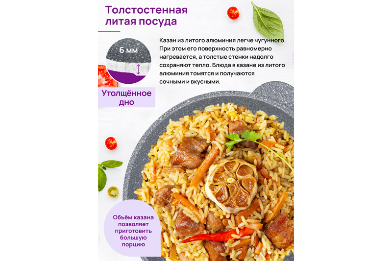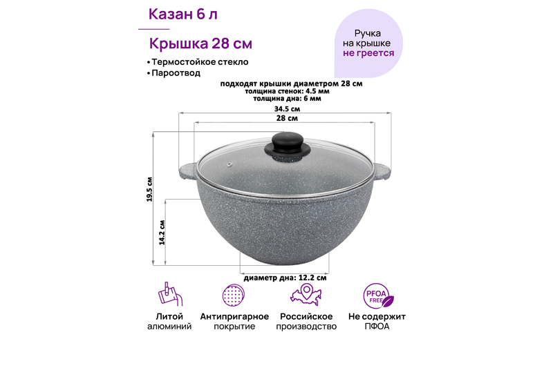 Казан "Гармония вкуса" объемом 6 литров с крышкой равномерно разогревается и распределяет тепло таким образом, что продукты в нем остаются сочными и сохраняют все свои полезные и вкусовые свойства. Казан выполнен из толстостенного литого алюминия и имеет ультрапрочное двухслойное антипригарное покрытие Cookmark. Покрытие устойчиво к царапинам и износу, полностью безопасно для здоровья и не содержит PFOA или других вредных веществ. Эксплуатация: не нагревать без продуктов. Дайте посуде остыть, прежде чем помещать ее в воду. Использовать только деревянные и силиконовые приборы. Не мыть абразивными или щелочными моющими средствами. Использовать в посудомоечной машине только в режиме "Эко". Подходит для всех типов плит, кроме индукционных. Можно использовать в духовом шкафу без крышки при температуре до 250 градусов.