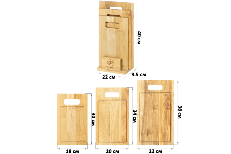 Набор состоит из трех разделочных досок и подставки. Доски выполнены из березы и различаются по размеру: 38х22х1,8 см, 34х20х1,8 см и 30х18х1,8 см. Такой набор станет не только надежным помощником в резке продуктов, но и стильным украшением кухни. По краям досок имеются канавки для жидкостей, чтобы сок от овощей и мяса не попадал на стол. Доски имеют отверстия для подвешивания, что позволит при необходимости хранить доски по отдельности. Доски подходят для красивой сервировки жареного мяса, овощей и прочих блюд. Доски уже пропитаны маслом. После каждого использования протирать влажной губкой. Не замачивать в воде. После мытья под струей воды протереть насухо. Не сушить около отопительных приборов и рядом с плитой. Хранить вертикально или в подвешенном состоянии в помещении с нормальным уровнем влажности. Не использовать в качестве подставки под горячее. Не мыть химическими средствами или в посудомоечной машине. Рекомендуется не реже одного раза в месяц обрабатывать все стороны растительным маслом. Так доска прослужит долго и будет радовать красотой и функциональностью!