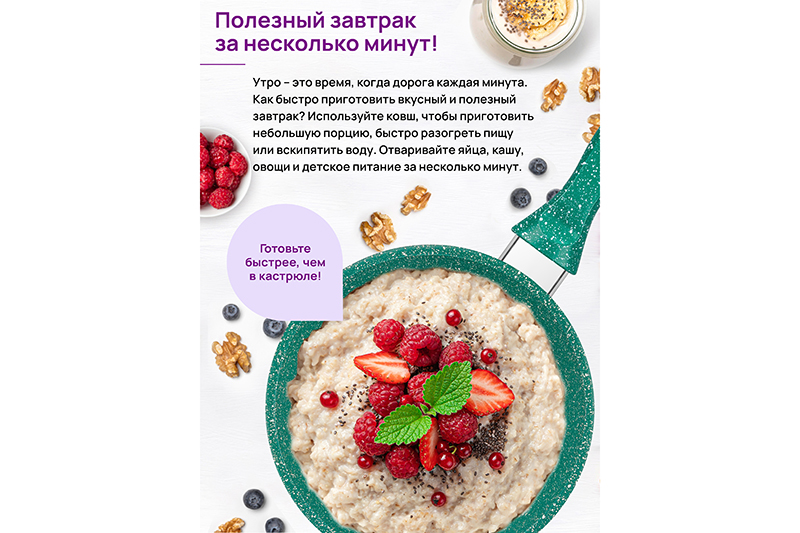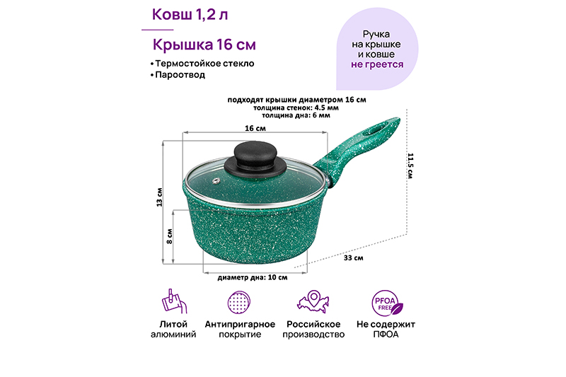 Ковш "Гармония вкуса" объемом 1,2 литра с крышкой равномерно разогревается и распределяет тепло таким образом, что продукты в нем остаются сочными и сохраняют все свои полезные и вкусовые свойства. Ковш выполнен из толстостенного литого алюминия и имеет ультрапрочное двухслойное антипригарное покрытие Cookmark. Покрытие устойчиво к царапинам и износу, полностью безопасно для здоровья и не содержит PFOA или других вредных веществ. Эксплуатация: не нагревать без продуктов. Дайте посуде остыть, прежде чем помещать ее в воду. Использовать только деревянные и силиконовые приборы. Не мыть абразивными или щелочными моющими средствами. Использовать в посудомоечной машине только в режиме "Эко". Подходит для всех типов плит, кроме индукционных.