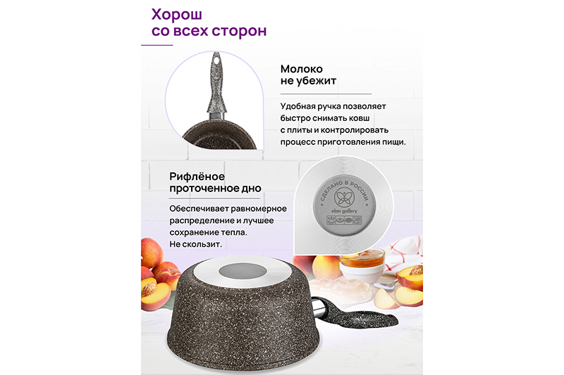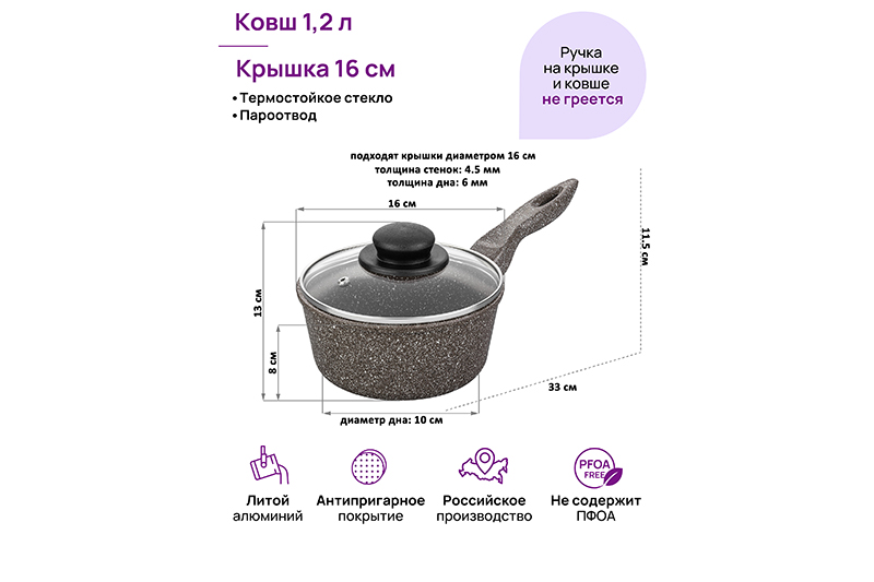 Ковш "Гармония вкуса" объемом 1,2 литра с крышкой равномерно разогревается и распределяет тепло таким образом, что продукты в нем остаются сочными и сохраняют все свои полезные и вкусовые свойства. Ковш выполнен из толстостенного литого алюминия и имеет ультрапрочное двухслойное антипригарное покрытие Cookmark. Покрытие устойчиво к царапинам и износу, полностью безопасно для здоровья и не содержит PFOA или других вредных веществ. Эксплуатация: не нагревать без продуктов. Дайте посуде остыть, прежде чем помещать ее в воду. Использовать только деревянные и силиконовые приборы. Не мыть абразивными или щелочными моющими средствами. Использовать в посудомоечной машине только в режиме "Эко". Подходит для всех типов плит, кроме индукционных.