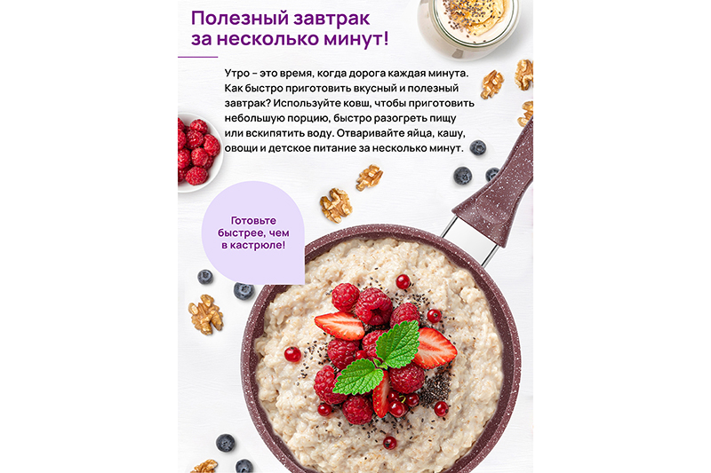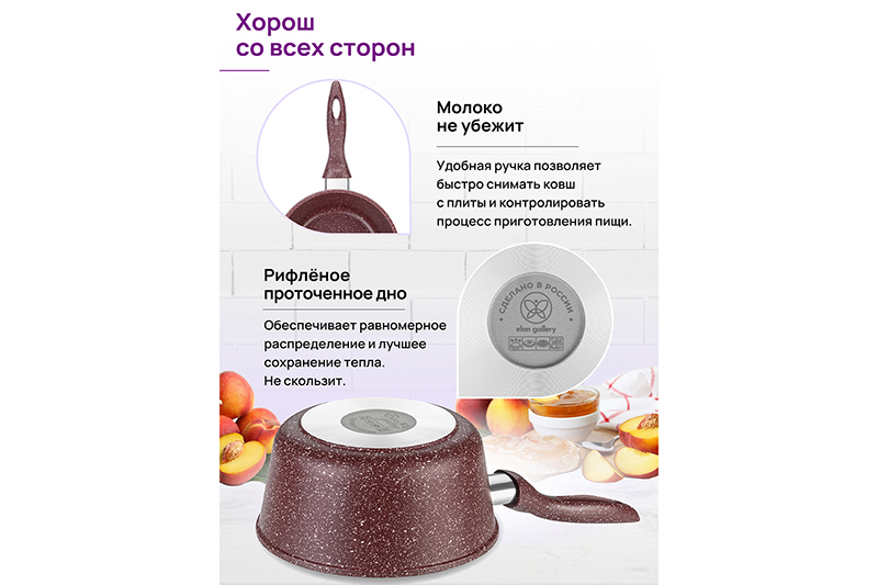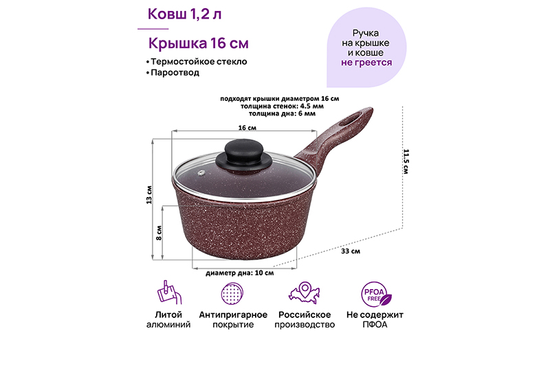 Ковш "Гармония вкуса" объемом 1,2 литра с крышкой равномерно разогревается и распределяет тепло таким образом, что продукты в нем остаются сочными и сохраняют все свои полезные и вкусовые свойства. Ковш выполнен из толстостенного литого алюминия и имеет ультрапрочное двухслойное антипригарное покрытие Cookmark. Покрытие устойчиво к царапинам и износу, полностью безопасно для здоровья и не содержит PFOA или других вредных веществ. Эксплуатация: не нагревать без продуктов. Дайте посуде остыть, прежде чем помещать ее в воду. Использовать только деревянные и силиконовые приборы. Не мыть абразивными или щелочными моющими средствами. Использовать в посудомоечной машине только в режиме "Эко". Подходит для всех типов плит, кроме индукционных.