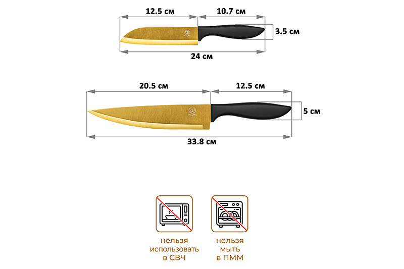 Набор 2 ножей 24*1,6*3,5 см + 33,8*2*5 см "Золото" с защитными пластиковыми чехлами