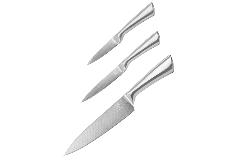 Набор Elan Gallery "Серебро" состоит из трёх ножей разной длины. В комплект входят: овощной нож размером 20,5х1,8х2,8 см (длина клинка – 8,6 см, длина рукоятки – 11,5 см, толщина рукоятки – 1,8 см), универсальный нож размером 23,5х1,8х2,8 см (длина клинка – 12,25 см, длина рукоятки – 11,5 см, толщина рукоятки – 1,8 см), поварской шеф-нож размером 33х2,3х4,3 см (длина клинка – 19,6 см, длина рукоятки – 13,5 см, толщина рукоятки – 2,3 см). Этот набор станет незаменимым помощником в процессе готовки и отлично справится с разделкой мяса или рыбы. Каждый нож имеет удобную ручку и острое лезвие из нержавеющей стали. Ножи выполнены в серебристом цвете. Это универсальные кухонные принадлежности. Их можно использовать как овощные, мясные или хлебные ножи. Маленький ножик подходит для резки мелких продуктов: овощей, фруктов или зелени. Его острое лезвие позволяет производить точные и аккуратные надрезы. Средний нож подойдет для нарезки колбасы, сыра или хлеба. Благодаря длинному лезвию нож позволяет резать продукты легко и без усилий. Большой поварской нож можно использовать для нарезки картофеля, рыбы, мяса или шинковки капусты. Удобная рукоятка обеспечивает комфортную работу с ножом. Эти универсальные кухонные принадлежности серебряного цвета удобны в использовании как мужчинами, так и женщинами. Набор ножей с лезвиями из нержавеющей стали станет настоящим помощником для профессионального повара. Подходят для мытья в посудомоечной машине. Этот набор станет незаменимым инвентарём на вашей кухне и поможет в приготовлении множества вкусных блюд!