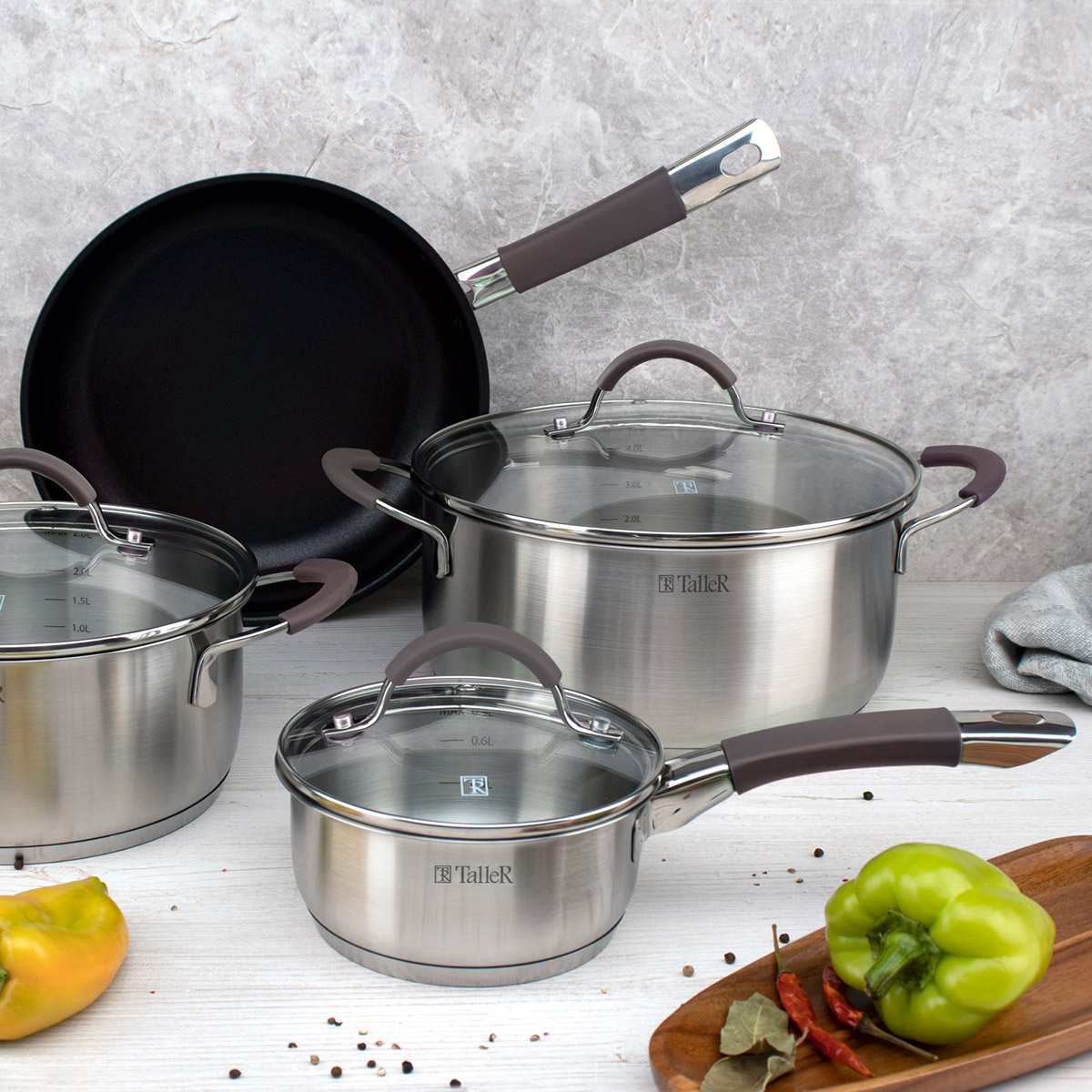 Кастрюли и ковш изготовлены из высококачественной нержавеющей стали марки 18/10. Толщина стенки - 0,5 мм, толщина дна - 4 мм. Капсулированное дно для лучшего распределения тепла. Полировка матовая внутри и снаружи. Крышки из жаропрочного стекла со стальным ободом с отверстием для выхода пара. Ручки из нержавеющей стали с силиконовыми вставками на точечной сварке. Цвет силиконовых вставок на ручках - коричневый. Есть отметки литража.