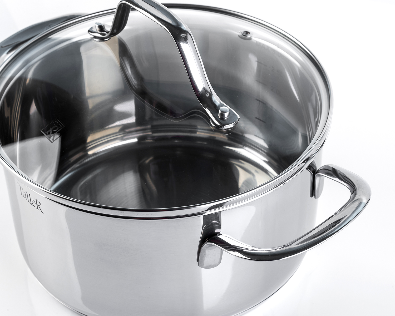 Толщина стенок – 0,5 мм, толщина дна - 2,7 мм. Внешняя и внутренняя полировка - зеркальная. Крышки из жаропрочного стекла с отверстием для выхода пара. Ручки с из нержавеющей стали. Есть отметки литража.