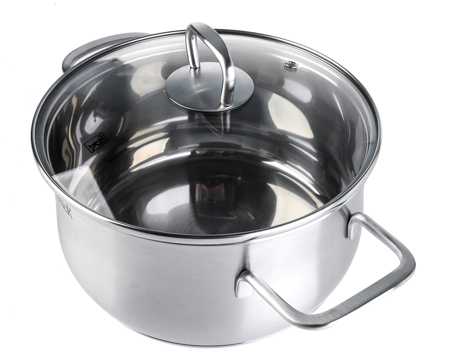 Толщина стенки - 0,6 мм, толщина дна - 2,8 мм. Полировка матовая снаружи, зеркальная внутри. Крышки из жаропрочного стекла со стальным ободом с отверстием для выхода пара. Ручки из нержавеющей стали на сварке. Есть отметки литража.