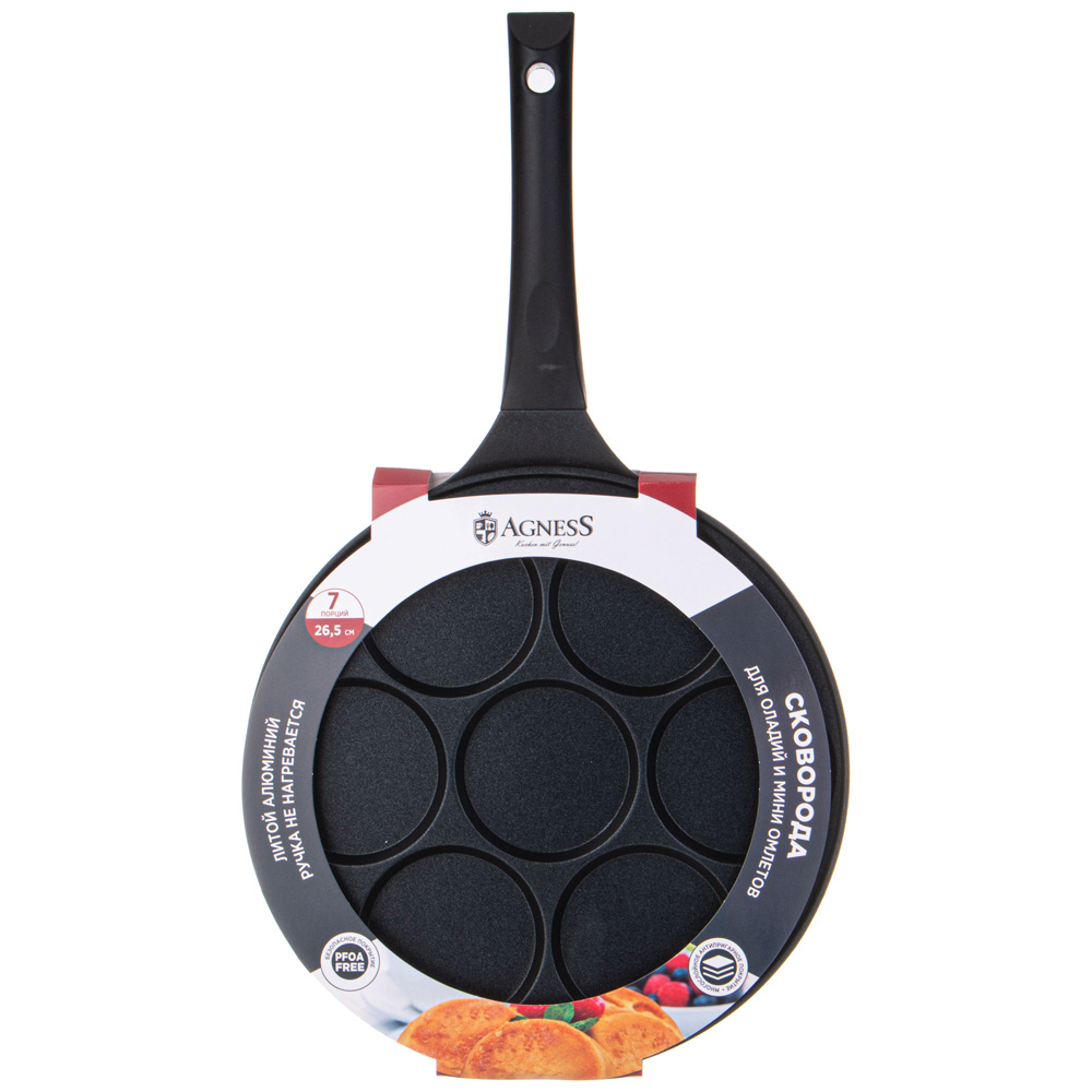 Сковороды AGNESS серии выполнены из литого алюминия. Такая посуда отличается высокой теплопроводностью и устойчивостью к деформациям. Необычный дизайн сковороды позволит приготовить идеальные оладушки и омлеты.
