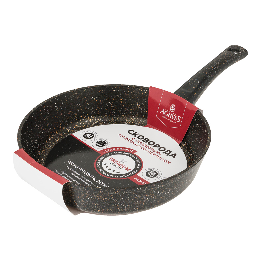Марка AGNESS представляет посуду турецкого производителя серии Granite. Корпус сковороды выполнен из кованного алюминия. Благодаря этой технологии корпус становится более прочным, износостойким и не подвержен деформации.
