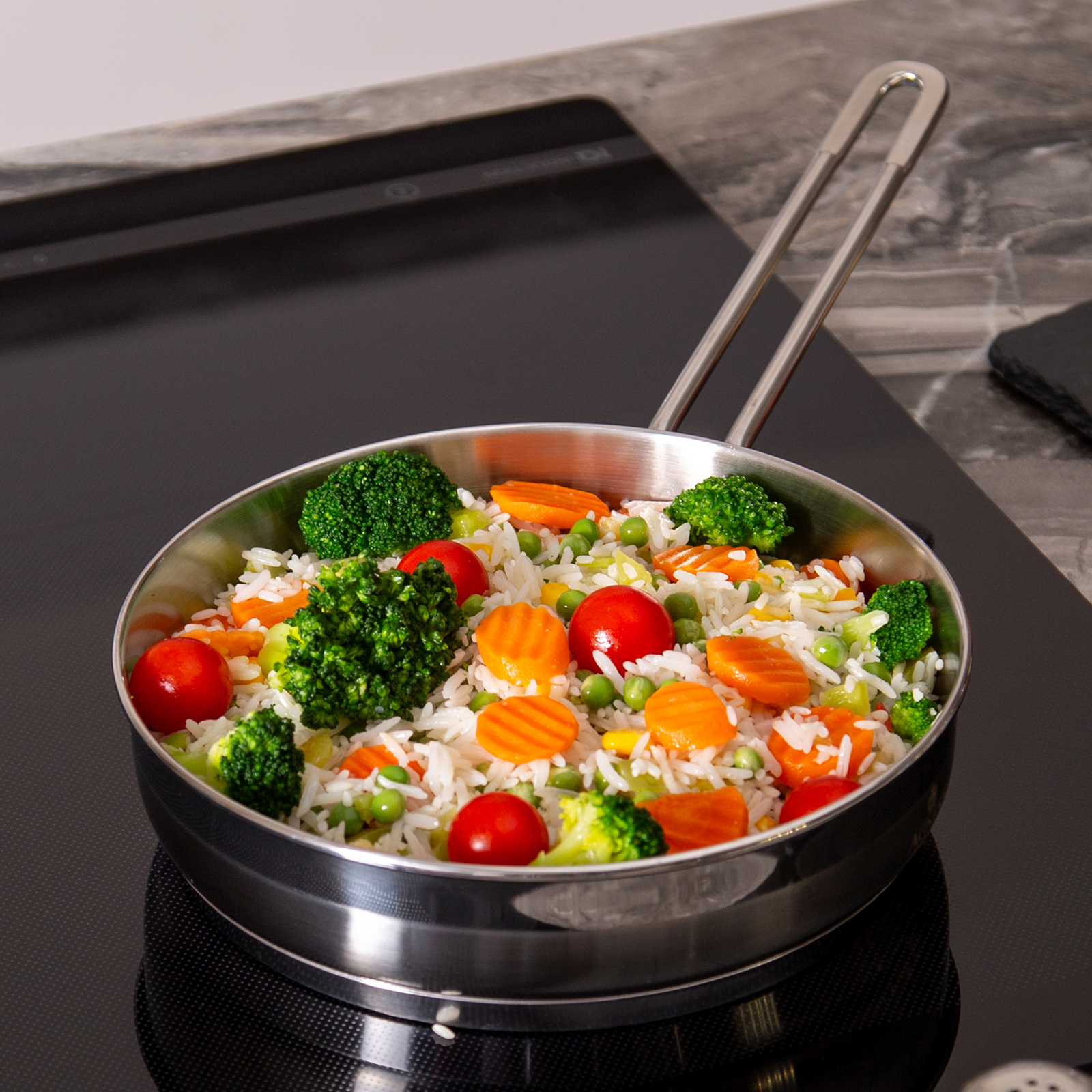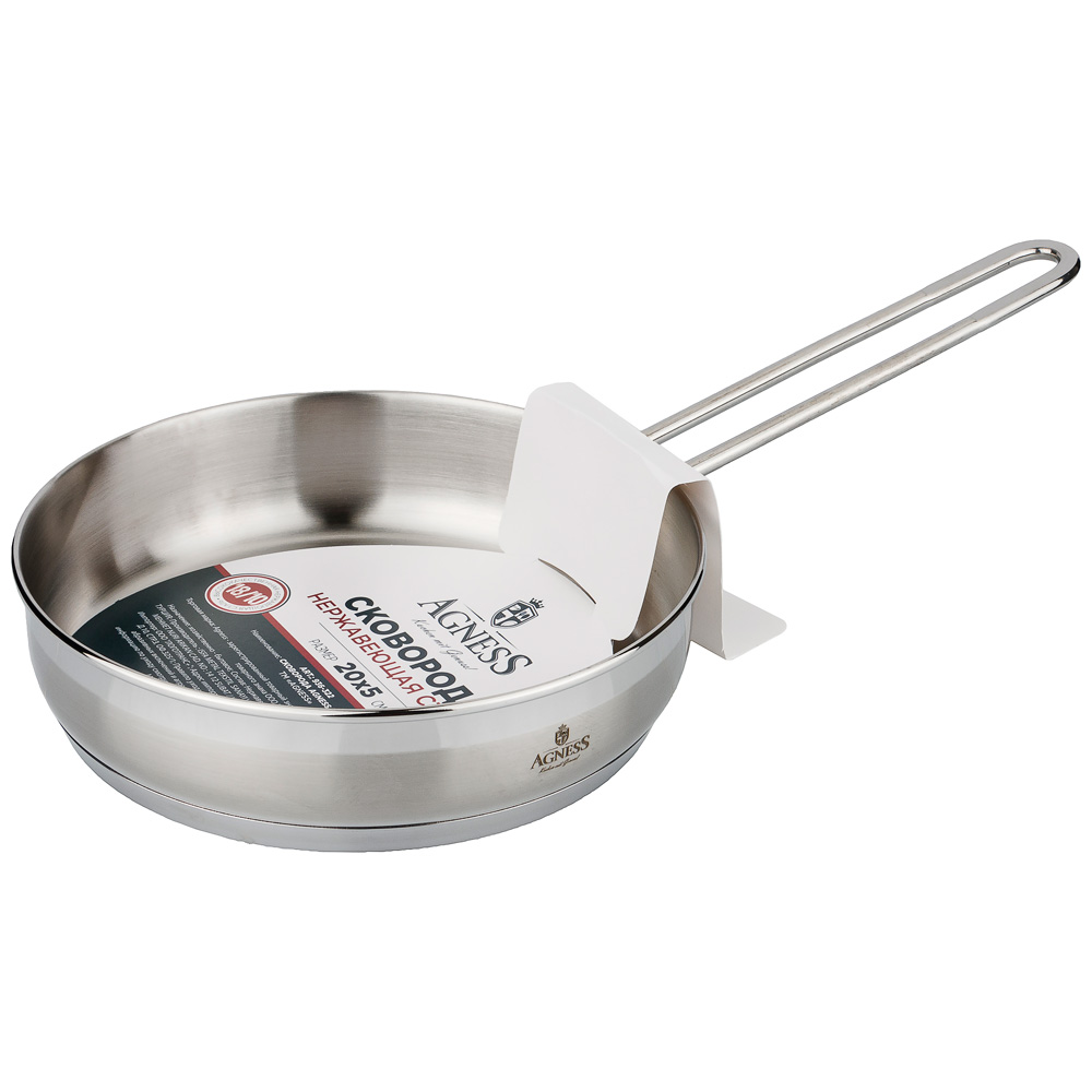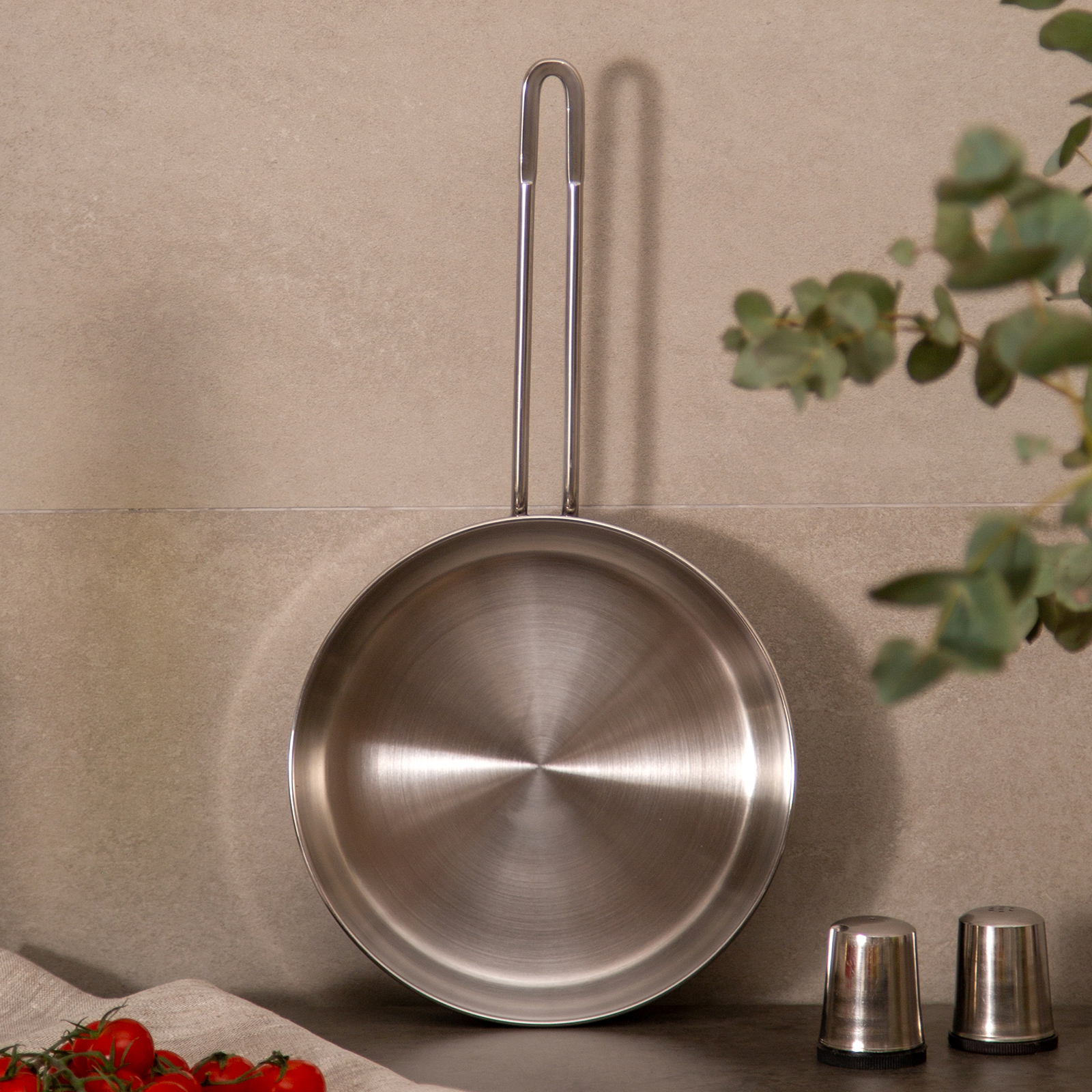 Корпус сковороды выполнен из ВЫСОКОКАЧЕСТВЕННОЙ НЕРЖАВЕЮЩЕЙ ХРОМНИКЕЛЕВОЙ СТАЛИ 18/10.
