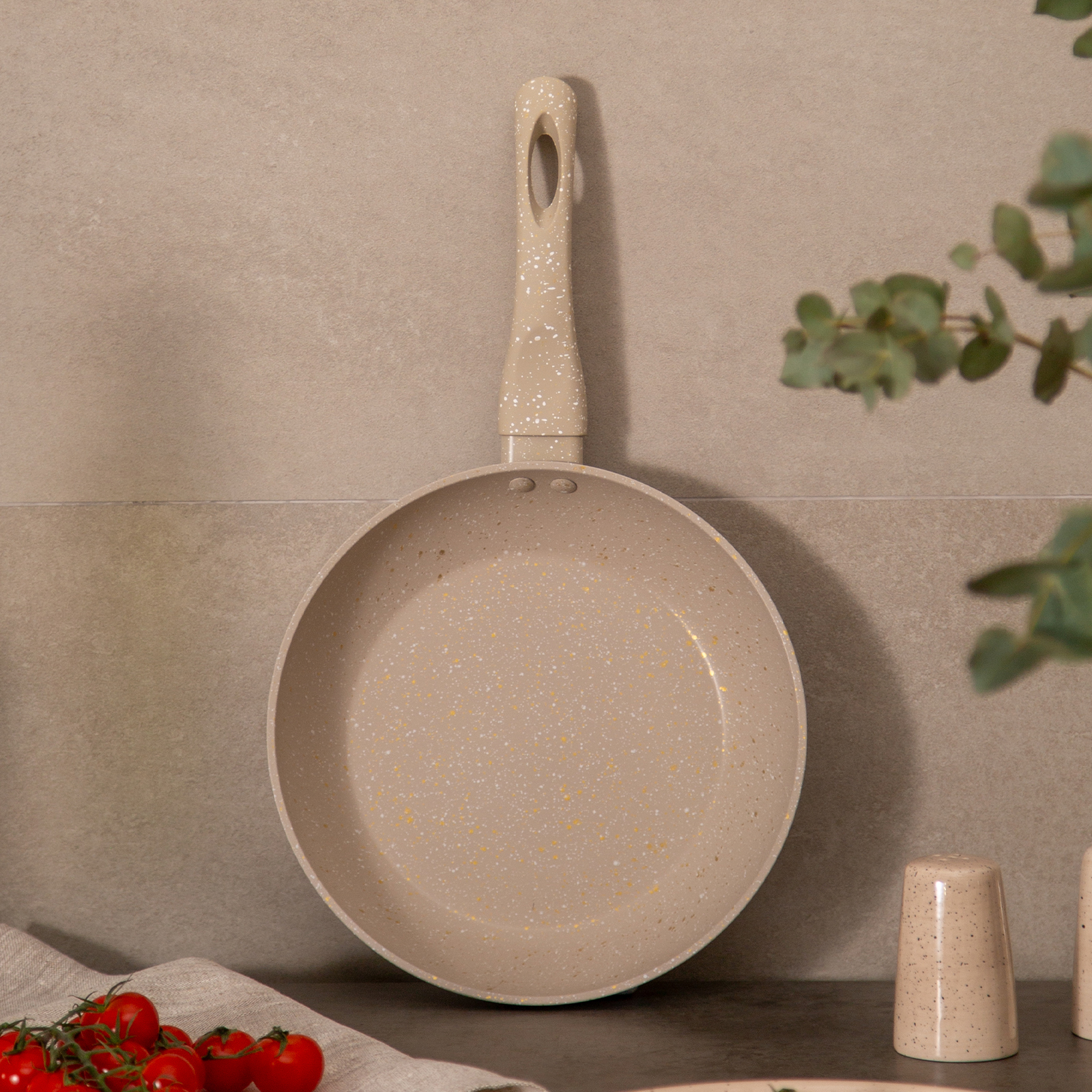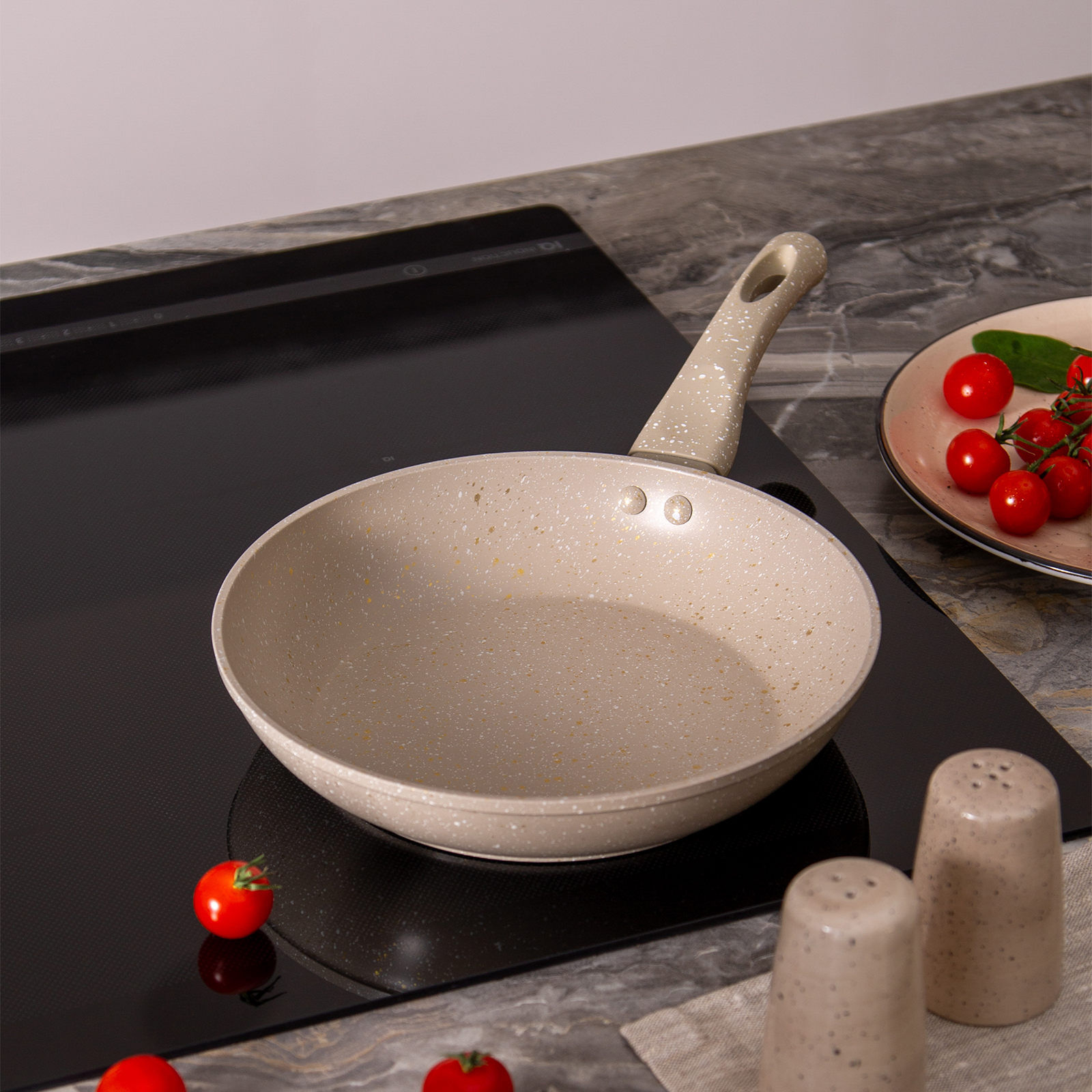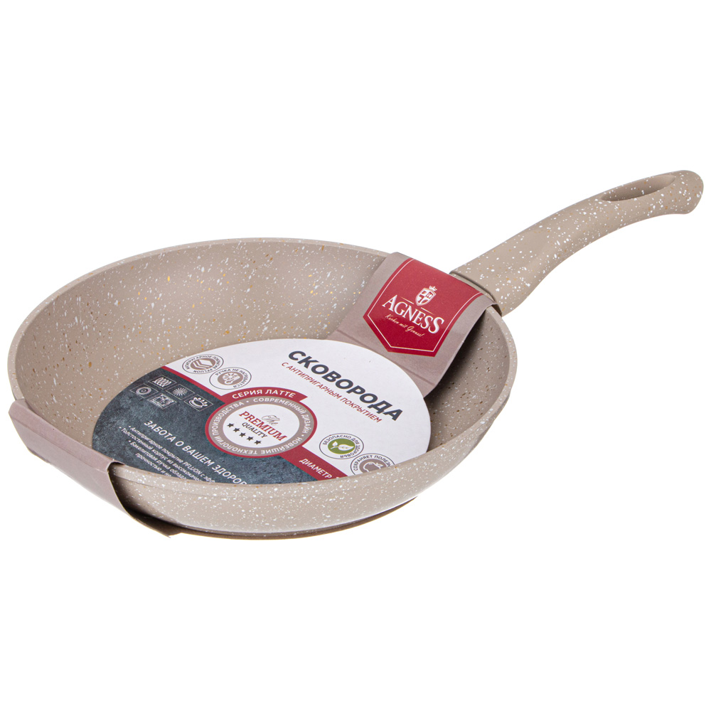 СКОВОРОДА AGNESS С АНТИПРИГАРНЫМ ПОКРЫТИЕМ "LATTE" - это идеальный выбор для тех, кто ценит удобство и функциональность в посуде. Одним из главных достоинств этой сковороды является ее антипригарное покрытие, которое позволяет готовить без использования большого количества масла, а также обеспечивает равномерное распределение тепла. Благодаря этому, продукты готовятся быстрее и сохраняют свои полезные свойства.Быстрое нагревание сокращает время приготовления и сохраняет вкус и аромат продуктов. Многослойная структура покрытия обеспечивает превосходные эксплуатационные качества и увеличивает срок службы, не содержит PFOA.Эргономичная ручка из бакелита с мягким покрытием SOFT TOUCH не нагревается и не плавится, обеспечивает безопасное использование сковородки в процессе приготовления пищи. Посуда AGNESS - это современный дизайн и новейшие технологии производства.