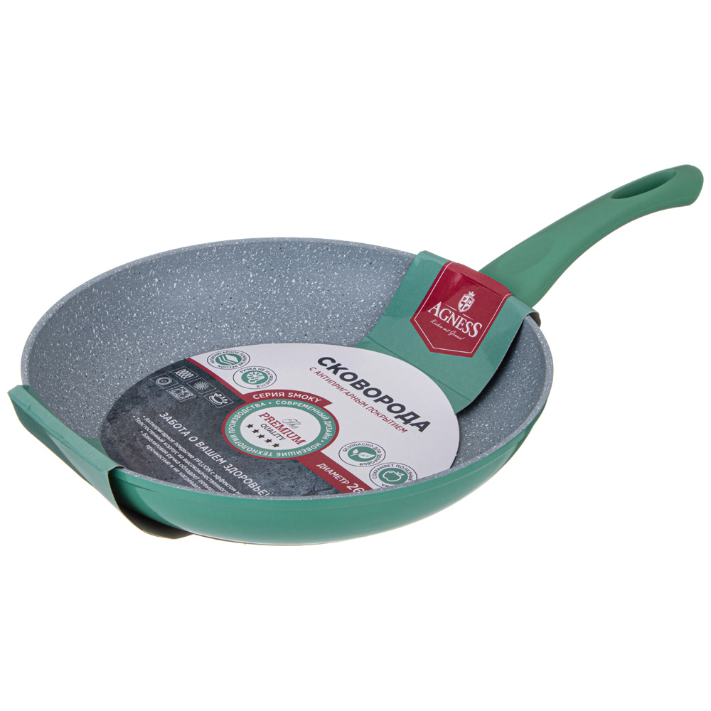СКОВОРОДА AGNESS С АНТИПРИГАРНЫМ ПОКРЫТИЕМ "SMOKY"- это идеальный выбор для тех, кто ценит удобство и функциональность в посуде. Одним из главных достоинств этой сковороды является ее антипригарное покрытие, которое позволяет готовить без использования большого количества масла, а также обеспечивает равномерное распределение тепла. Благодаря этому, продукты готовятся быстрее и сохраняют свои полезные свойства.Быстрое нагревание сокращает время приготовления и сохраняет вкус и аромат продуктов. Многослойная структура покрытия обеспечивает превосходные эксплуатационные качества и увеличивает срок службы, не содержит PFOA.Эргономичная ручка из бакелита с мягким покрытием SOFT TOUCH не нагревается и не плавится, обеспечивает безопасное использование сковородки в процессе приготовления пищи. Посуда AGNESS - это современный дизайн и новейшие технологии производства.