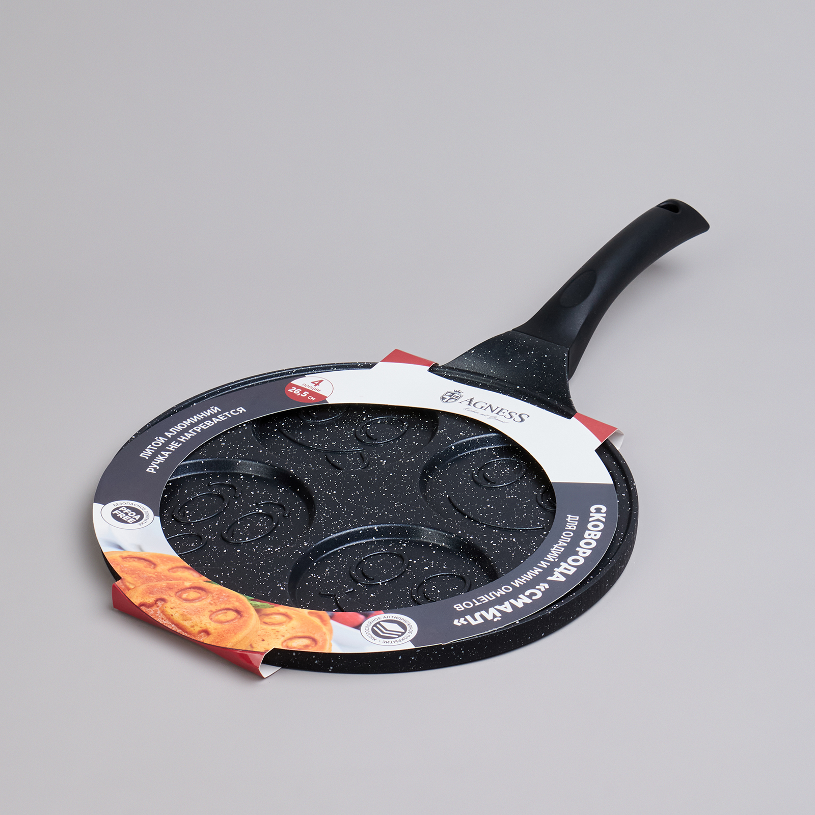 Сковороды AGNESS серии "СМАЙЛ" выполнены из литого алюминия. Такая посуда отличается высокой теплопроводностью и устойчивостью к деформациям. Необычный дизайн сковороды позволит приготовить интересные и веселые оладушки и омлеты.