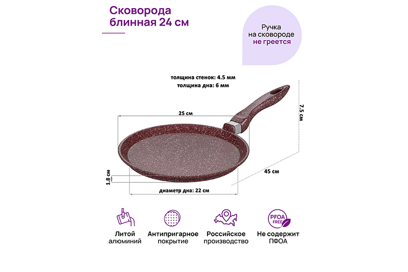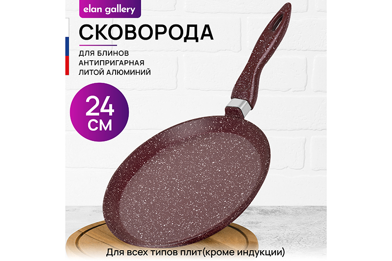 Сковорода блинная Elan Gallery "Гармония вкуса" в оттенке "Рубин" диаметром 24 см равномерно разогревается и распределяет тепло таким образом, чтобы продукты сохраняли все свои полезные и вкусовые свойства. Сковорода изготовлена из литого алюминия и имеет ультрапрочное двухслойное антипригарное покрытие Cookmark. Оно защищает блинчики от пригорания и позволяет переворачивать их лопаткой без особого труда. Выполнена в стильном дизайне. Покрытие устойчиво к царапинам и износу, полностью безопасно для здоровья и не содержит PFOA или других вредных веществ. Готовьте блины идеальной формы на завтрак и радуйте ими своих близких! Эксплуатация: не нагревать без продуктов. Дайте посуде остыть, прежде чем помещать ее в воду. Использовать только деревянные и силиконовые приборы. Не мыть абразивными или щелочными моющими средствами. Использовать в посудомоечной машине только в режиме "Эко" с применением средств, не содержащих щелочи. Подходит для всех типов плит, кроме индукционных. Блинница станет идеальным подарком для женщин и придаст процессу приготовления пищи новый уровень комфорта. Подарите универсальную кухонную утварь вещь маме, подруге, сестре или тёте. Хорошая блинная сковородка – мечта любой хозяйки! В серии "Гармония вкуса" вы найдёте любые кухонные принадлежности и инвентарь для вашего дома. Соберите набор для вашей кухни в едином стиле!