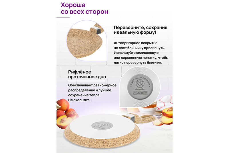 Сковорода блинная Elan Gallery "Гармония вкуса" в оттенке "Медовый гранит" диаметром 26 см равномерно разогревается и распределяет тепло таким образом, чтобы продукты сохраняли все свои полезные и вкусовые свойства. Сковорода изготовлена из литого алюминия и имеет ультрапрочное двухслойное антипригарное покрытие Cookmark. Оно защищает блинчики от пригорания и позволяет переворачивать их лопаткой без особого труда. Выполнена в стильном дизайне. Покрытие устойчиво к царапинам и износу, полностью безопасно для здоровья и не содержит PFOA или других вредных веществ. Готовьте блины идеальной формы на завтрак и радуйте ими своих близких! Эксплуатация: не нагревать без продуктов. Дайте посуде остыть, прежде чем помещать ее в воду. Использовать только деревянные и силиконовые приборы. Не мыть абразивными или щелочными моющими средствами. Использовать в посудомоечной машине только в режиме "Эко" с применением средств, не содержащих щелочи. Подходит для всех типов плит, кроме индукционных. Блинница станет идеальным подарком для женщин и придаст процессу приготовления пищи новый уровень комфорта. Подарите универсальную кухонную утварь вещь маме, подруге, сестре или тёте. Хорошая блинная сковородка – мечта любой хозяйки! В серии "Гармония вкуса" вы найдёте любые кухонные принадлежности и инвентарь для вашего дома. Соберите набор для вашей кухни в едином стиле!
