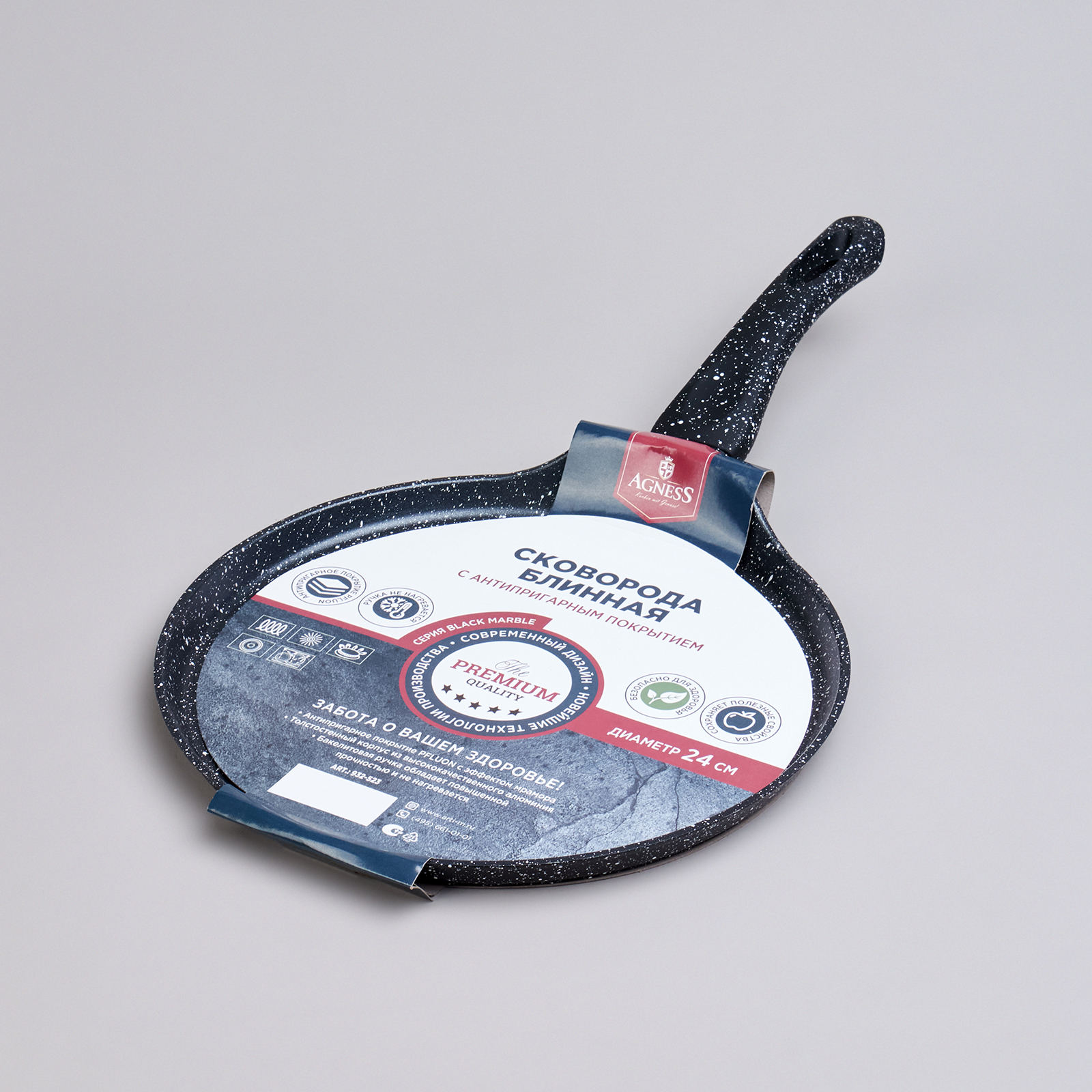 СКОВОРОДА БЛИННАЯ AGNESS С АНТИПРИГАРНЫМ ПОКРЫТИЕМ "BLACK MARBLE" - это идеальный выбор для тех, кто ценит удобство и функциональность в посуде.