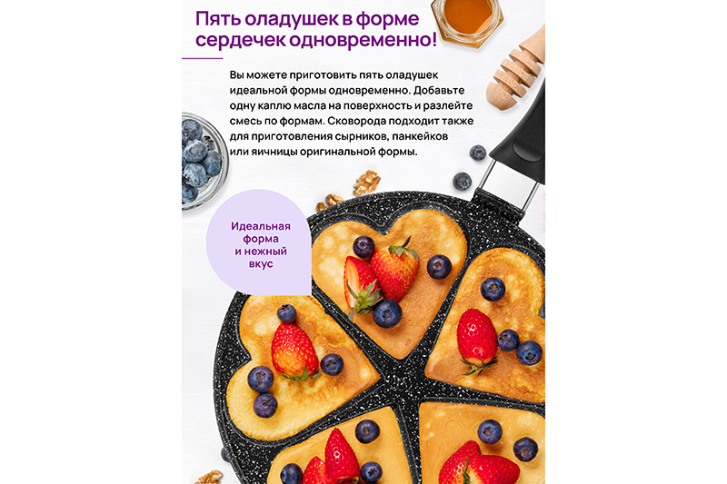 Сковорода для оладий 26 см ГАРМОНИЯ ВКУСА "Черный мрамор" сердце н/р, 48*27*5,5 см.