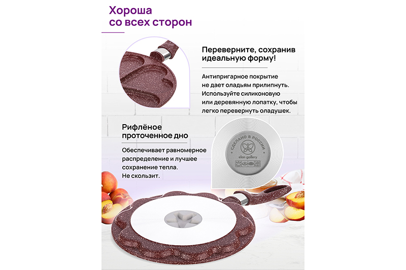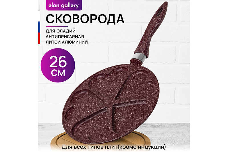 Сковорода оладница Elan Gallery "Рубин" из серии "Гармония вкуса" диаметром 26 см имеет отсеки, благодаря которым продукты будут иметь ровную и красивую форму сердечек. Глубина ячеек 1 см. За счёт фигурных секций не понадобятся специальное приспособление или формочка, чтобы придать блюду фигурную форму. Сковородка универсальная: подойдет для жарки блинчиков, оладий или порционной яичницы. Оладница поможет быстро приготовить на завтрак оладушки, панкейки и блюда из яиц. Можно использовать для эстетичной сервировки стола. Блинная сковорода выполнена из литого алюминия, имеет высококачественное антипригарное покрытие Cookmark. Блинница имеет декоративный каменный узор, напоминающий гранитную крошку. Ручка выполнена из жаропрочного бакелита и не нагревается при приготовлении (не рассчитана на прямой контакт с огнем). Алюминиевая блинница быстро разогревается: не греть без продуктов. Подходит для газовых, электрических, стеклокерамических плит. Не для индукции. Использовать только деревянные или силиконовые кухонные принадлежности и лопатки. Использовать в посудомоечной машине только в режиме "Эко" с применением средств, не содержащих щелочи. Сковорода станет идеальным подарком для женщин и придаст процессу приготовления пищи новый уровень комфорта. Подарите такую универсальную вещь маме, подруге, сестре или тёте. Хорошая сковородка – мечта любой хозяйки! В серии "Гармония вкуса" вы найдёте любой кухонный инвентарь для вашего дома. Соберите набор посуды для вашей кухни в едином стиле!