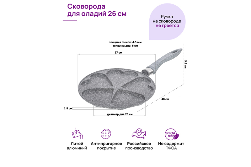 Сковорода для оладий 26 см ГАРМОНИЯ ВКУСА "Серый мрамор" сердце н/р, 48*27*5,5 см
