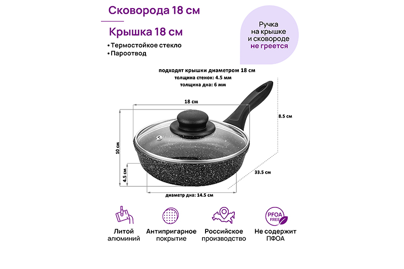 Глубокая сковорода Elan Gallery "Чёрный мрамор" из серии "Гармония вкуса" диаметром 18 см с крышкой равномерно разогревается и распределяет тепло таким образом, что продукты в ней сохраняют свои полезные свойства, сочность и вкус. Диаметр дна сковороды — 14,5 см. Стильный дизайн, имитирующий мрамор, подойдет к любому интерьеру вашей кухни. Сковорода с глубоким дном выполнена из толстостенного литого алюминия и имеет ультрапрочное двухслойное антипригарное покрытие Cookmark. Оно устойчиво к царапинам и износу, полностью безопасно для здоровья и не содержит PFOA или других вредных веществ. Сковороду можно использовать для жарки с минимальным количеством масла для приготовления здоровой пищи, что оценит любой гурман. Готовьте дома любимые стейки, они сохранят свою сочность, нежность и аромат! Сковорода подходит для приготовления блюд из рыбы, мяса, овощей, а также плова. Сковородка станет идеальным помощником для создания завтрака, например: яичницы, омлета, блинов, оладий. Имеет удобную ручку, что обеспечивает надежный захват при подаче еды с плиты на стол. Стеклянная крышка позволит сохранить тепло блюда, защитит от брызг, а также поможет следить за процессом приготовления пищи. Эксплуатация: не нагревать без продуктов. Дайте посуде остыть, прежде чем помещать ее в воду. Использовать только деревянные, силиконовые и пластиковые лопатки без острых краёв. Не мыть абразивными или щелочными моющими средствами. Использовать в посудомоечной машине только в режиме "Эко" с использованием средств, не содержащих щелочи. Подходит для всех типов плит, кроме индукционных. Сковорода станет идеальным подарком для женщин и придаст процессу приготовления пищи новый уровень комфорта. Подарите такую универсальную вещь маме, подруге, сестре или тёте. Хорошая сковорода – мечта любой хозяйки!