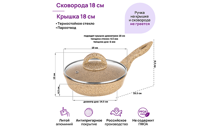 Сковорода глубокая 18 см ГАРМОНИЯ ВКУСА "Медовый гранит" С КРЫШКОЙ ф18, н/р, 33,5*19*12 см
