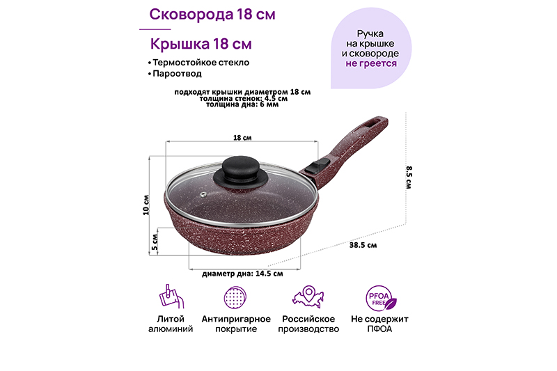 Сковорода глубокая 18 см ГАРМОНИЯ ВКУСА "Рубин" С КРЫШКОЙ ф18, с/р 38,5*19*10 см