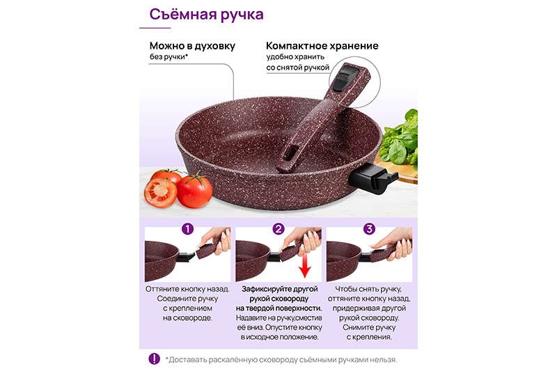 Глубокая сковорода Elan Gallery "Рубин" с крышкой и съёмной ручкой из серии "Гармония вкуса" диаметром 18 см равномерно разогревается и распределяет тепло, поэтому продукты в ней сохраняют полезные свойства и сочность. Диаметр дна — 14,5 см. Длина ручки 20 см. Стильный дизайн подойдет к любому интерьеру кухни. Подходит для приготовления стейков из рыбы, мяса или блюд из овощей. Маленькая сковорода с глубоким дном выполнена из толстостенного литого алюминия и имеет ультрапрочное двухслойное антипригарное покрытие Cookmark. Оно устойчиво к царапинам и износу, безопасно для здоровья и не содержит PFOA или других вредных веществ. Используйте для жарки котлет или картофеля с минимальным количеством масла. Здоровую пищу оценит любой гурман! Готовьте на завтрак оладьи или блюда из яиц: яичницу, омлет. Порадуйте близких блинами на Масленицу, ни один блинчик не подгорит. Алюминиевая сковородка с толстым дном имеет удобную ручку, которая обеспечивает надежный захват при подаче еды с плиты на стол. Без крышки и ручки можно использовать в духовом шкафу как форму для запекания при температуре до 250°C. Не использовать съёмную ручку, чтобы достать раскалённую сковороду из духовой печи! Эксплуатация: не нагревать без продуктов. Дайте посуде остыть, прежде чем помещать ее в воду. Использовать только деревянные, силиконовые и пластиковые лопатки без острых краёв. Не мыть абразивными или щелочными моющими средствами. Использовать в ПММ в режиме "Эко" со средством, не содержащим щёлочи. Подходит для стеклокерамических, газовых и электрических плит. Не подходит для индукционных плит. Кухонная утварь станет приятным подарком на любой праздник и придаст процессу приготовления пищи комфорта. Хорошая сковорода – мечта любой хозяйки! Сковородка станет незаменимым инвентарем на вашей кухне и наполнит процесс приготовления пищи удовольствием!