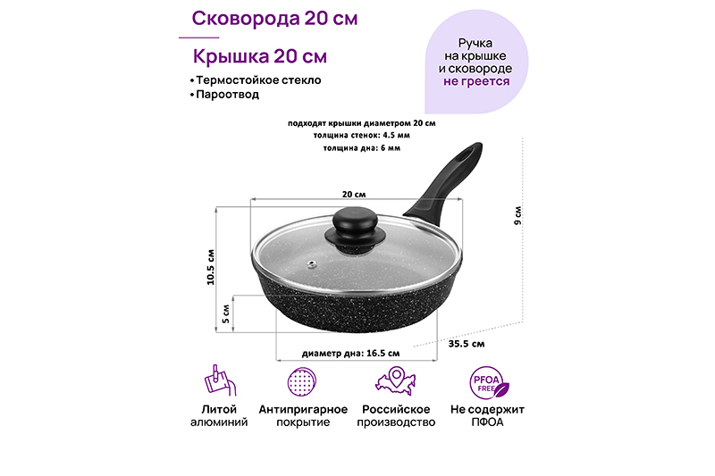 Сковорода глубокая "Гармония вкуса" 20 см с крышкой равномерно разогревается и распределяет тепло таким образом, что продукты в ней остаются сочными и сохраняют все свои полезные и вкусовые свойства. Сковорода выполнена из толстостенного литого алюминия и имеет ультрапрочное двухслойное антипригарное покрытие Cookmark. Покрытие устойчиво к царапинам и износу, полностью безопасно для здоровья и не содержит PFOA или других вредных веществ. Эксплуатация: не нагревать без продуктов. Дайте посуде остыть, прежде чем помещать ее в воду. Использовать только деревянные и силиконовые лопатки. Не мыть абразивными или щелочными моющими средствами. Использовать в посудомоечной машине только в режиме "Эко". Подходит для всех типов плит, кроме индукционных.
