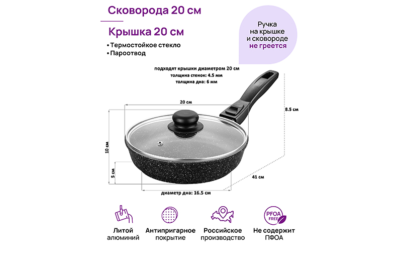 Глубокая сковорода Elan Gallery "Чёрный мрамор" с крышкой и съёмной ручкой из серии "Гармония вкуса" диаметром 20 см равномерно разогревается и распределяет тепло, поэтому продукты в ней сохраняют полезные свойства и сочность. Диаметр дна — 16,5 см. Стильный дизайн подойдет к любому интерьеру кухни. Подходит для приготовления стейков из рыбы, мяса или блюд из овощей. Сковорода с глубоким дном выполнена из толстостенного литого алюминия и имеет ультрапрочное двухслойное антипригарное покрытие Cookmark. Оно устойчиво к царапинам и износу, безопасно для здоровья и не содержит PFOA или других вредных веществ. Используйте для жарки котлет или картофеля с минимальным количеством масла. Здоровую пищу оценит любой гурман! Готовьте на завтрак оладьи или блюда из яиц: яичницу, омлет. Порадуйте близких большой порцией блинов на Масленицу, ни один блинчик не подгорит. Алюминиевая сковородка с толстым дном имеет удобную ручку, которая обеспечивает надежный захват при подаче еды с плиты на стол. Без крышки и ручки можно использовать в духовом шкафу как форму для запекания при температуре до 250°C. Не использовать съёмную ручку, чтобы достать раскалённую сковороду из духовой печи! Приготовьте румяную курочку в духовке и порадуйте своих близких. Эксплуатация: не нагревать без продуктов. Дайте посуде остыть, прежде чем помещать ее в воду. Использовать только деревянные, силиконовые и пластиковые лопатки без острых краёв. Не мыть абразивными или щелочными моющими средствами. Использовать в ПММ в режиме "Эко" со средством, не содержащим щёлочи. Подходит для стеклокерамических, газовых и электрических плит. Не подходит для индукционных плит. Кухонная утварь станет приятным подарком для женщин на День Рождения, 8 Марта и придаст процессу приготовления пищи комфорта. Подарите универсальную вещь маме, подруге, сестре или бабушке. Хорошая сковорода – мечта любой хозяйки! Сковородка станет незаменимым инвентарем на вашей кухне и наполнит процесс приготовления пищи удовольствием!