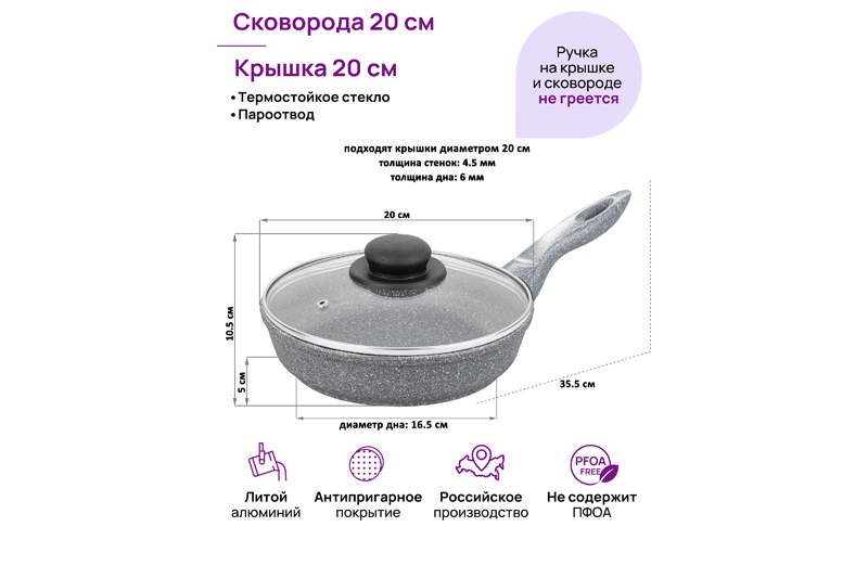 Сковорода глубокая 20 см ГАРМОНИЯ ВКУСА "Серый мрамор" С КРЫШКОЙ ф20, н/р, 35,5*21*10,5 см