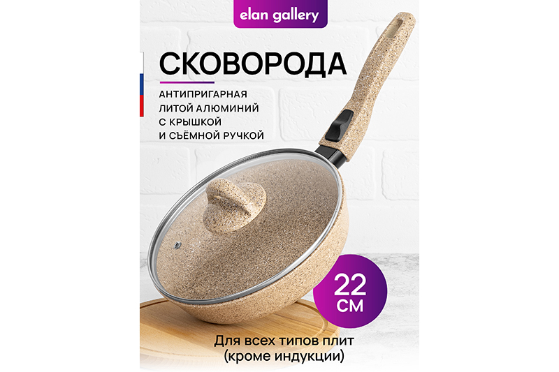 Глубокая сковорода Elan Gallery "Медовый гранит" с крышкой и съёмной ручкой из серии "Гармония вкуса" диаметром 22 см равномерно разогревается и распределяет тепло, поэтому продукты в ней сохраняют полезные свойства и сочность. Диаметр дна — 16 см. Стильный дизайн подойдет к любому интерьеру кухни. Подходит для приготовления стейков из рыбы, мяса или блюд из овощей. Сковорода с глубоким дном выполнена из толстостенного литого алюминия и имеет ультрапрочное двухслойное антипригарное покрытие Cookmark. Оно устойчиво к царапинам и износу, безопасно для здоровья и не содержит PFOA или других вредных веществ. Используйте для жарки котлет или картофеля с минимальным количеством масла. Здоровую пищу оценит любой гурман! Готовьте на завтрак оладьи или блюда из яиц: яичницу, омлет. Порадуйте близких большой порцией блинов на Масленицу, ни один блинчик не подгорит. Алюминиевая сковородка с толстым дном имеет удобную ручку, которая обеспечивает надежный захват при подаче еды с плиты на стол. Без крышки и ручки можно использовать в духовом шкафу как форму для запекания при температуре до 250°C. Не использовать съёмную ручку, чтобы достать раскалённую сковороду из духовой печи! Приготовьте румяную курочку в духовке и порадуйте своих близких. Эксплуатация: не нагревать без продуктов. Дайте посуде остыть, прежде чем помещать ее в воду. Использовать только деревянные, силиконовые и пластиковые лопатки без острых краёв. Не мыть абразивными или щелочными моющими средствами. Использовать в ПММ в режиме "Эко" со средством, не содержащим щёлочи. Подходит для стеклокерамических, газовых и электрических плит. Не подходит для индукционных плит. Кухонная утварь станет приятным подарком для женщин на День Рождения, 8 Марта и придаст процессу приготовления пищи комфорта. Подарите универсальную вещь маме, подруге, сестре или бабушке. Хорошая сковорода – мечта любой хозяйки! Сковородка станет незаменимым инвентарем на вашей кухне и наполнит процесс приготовления пищи удовольствием!