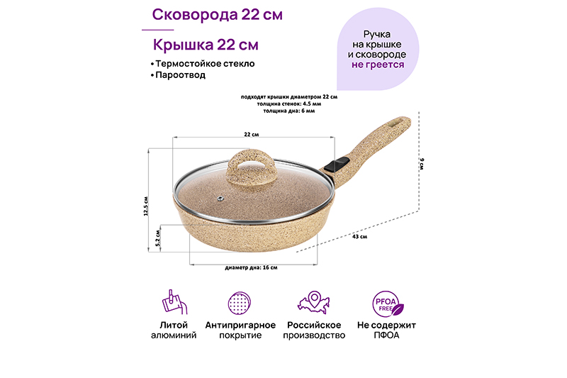 Сковорода глубокая 22 см ГАРМОНИЯ ВКУСА "Медовый гранит" С КРЫШКОЙ ф22, с/р,43*23*12,5 см
