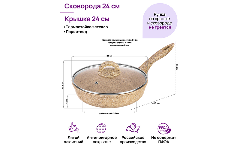 Сковорода глубокая 24 см ГАРМОНИЯ ВКУСА "Медовый гранит" С КРЫШКОЙ ф24, н/р, 43,5*25*13,5 см