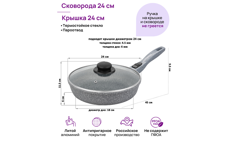 Глубокая сковорода Elan Gallery "Серый мрамор" с крышкой и съёмной ручкой из серии "Гармония вкуса" диаметром 24 см равномерно разогревается и распределяет тепло, поэтому продукты в ней сохраняют полезные свойства и сочность. Диаметр дна — 18 см. Стильный дизайн подойдет к любому интерьеру кухни. Подходит для приготовления стейков из рыбы, мяса или блюд из овощей. Сковорода с глубоким дном выполнена из толстостенного литого алюминия и имеет ультрапрочное двухслойное антипригарное покрытие Cookmark. Оно устойчиво к царапинам и износу, безопасно для здоровья и не содержит PFOA или других вредных веществ. Используйте для жарки котлет или картофеля с минимальным количеством масла. Здоровую пищу оценит любой гурман! Готовьте на завтрак оладьи или блюда из яиц: яичницу, омлет. Порадуйте близких большой порцией блинов на Масленицу, ни один блинчик не подгорит. Алюминиевая сковородка с толстым дном имеет удобную ручку, которая обеспечивает надежный захват при подаче еды с плиты на стол. Без крышки и ручки можно использовать в духовом шкафу как форму для запекания при температуре до 250°C. Не использовать съёмную ручку, чтобы достать раскалённую сковороду из духовой печи! Приготовьте румяную курочку в духовке и порадуйте своих близких. Эксплуатация: не нагревать без продуктов. Дайте посуде остыть, прежде чем помещать ее в воду. Использовать только деревянные, силиконовые и пластиковые лопатки без острых краёв. Не мыть абразивными или щелочными моющими средствами. Использовать в ПММ в режиме "Эко" со средством, не содержащим щёлочи. Подходит для стеклокерамических, газовых и электрических плит. Не подходит для индукционных плит. Кухонная утварь станет приятным подарком для женщин на День Рождения, 8 Марта и придаст процессу приготовления пищи комфорта. Подарите универсальную вещь маме, подруге, сестре или бабушке. Хорошая сковорода – мечта любой хозяйки! Сковородка станет незаменимым инвентарем на вашей кухне и наполнит процесс приготовления пищи удовольствием!