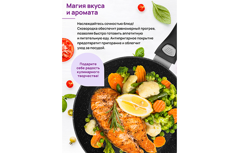 Глубокая сковорода «Чёрный мрамор» из серии Fierra имеет размер 47,5х27,5х12 см. Высота без крышки – 6 см, диаметр дна – 21 см, диаметр индукционного дна – 18 см. Длина ручки – 20 см. Изготовлена из кованого алюминия, имеет ультрапрочное антипригарное покрытие PFLUON COOКMARK. Оно устойчиво к износу и царапинам, не содержит PFOA и другие вредные вещества. Изделие равномерно нагревается и распределяет тепло, благодаря чему продукты к нём надолго сохраняют сочность и полезные свойства. Ручка из бакелита легко снимается, без неё ёмкость поместится в холодильник и в духовку. Покрытие Soft touch обеспечивает дополнительный комфорт при переноске. Стеклянная крышка с тремя пароотводами позволит вам следить за степенью готовности блюд, а большая пластиковая ручка обеспечит удобство снятия. После мытья поверхность изделия моментально высыхает, и вам не придётся вытирать его или долго сушить. Алюминиевая сковорода поможет в приготовлении вкусных блюд дома. Используйте её для жарки котлет, стейков или картофеля с минимальным количеством масла. Приготовьте на завтрак оладьи, яичницу или омлет. Порадуйте близких большим количеством блинов на Масленицу – ни один блинчик не подгорит. Запеките румяную курочку и порадуйте своих близких. Благодаря лёгкому весу удобна для повседневного использования. Эксплуатация: не нагревайте без продуктов. Ставьте посуду строго по центру источника тепла. Не используйте металлические принадлежности, пользуйтесь силиконовыми и деревянными лопатками. Без крышки и ручки можно использовать в духовом шкафу при температуре до 230 градусов. Не используйте съёмную ручку, чтобы достать раскалённую сковородку из духовки. Подходит для всех типов плит, включая индукцию. Не используйте абразивные и щелочные средства. Подходит для использования в посудомоечной машине в режиме «Эко». Красивая сковородка станет отличным подарком любой хозяйке. Пополните свой кухонный инвентарь и привнесите удовольствие в процесс приготовления пищи!