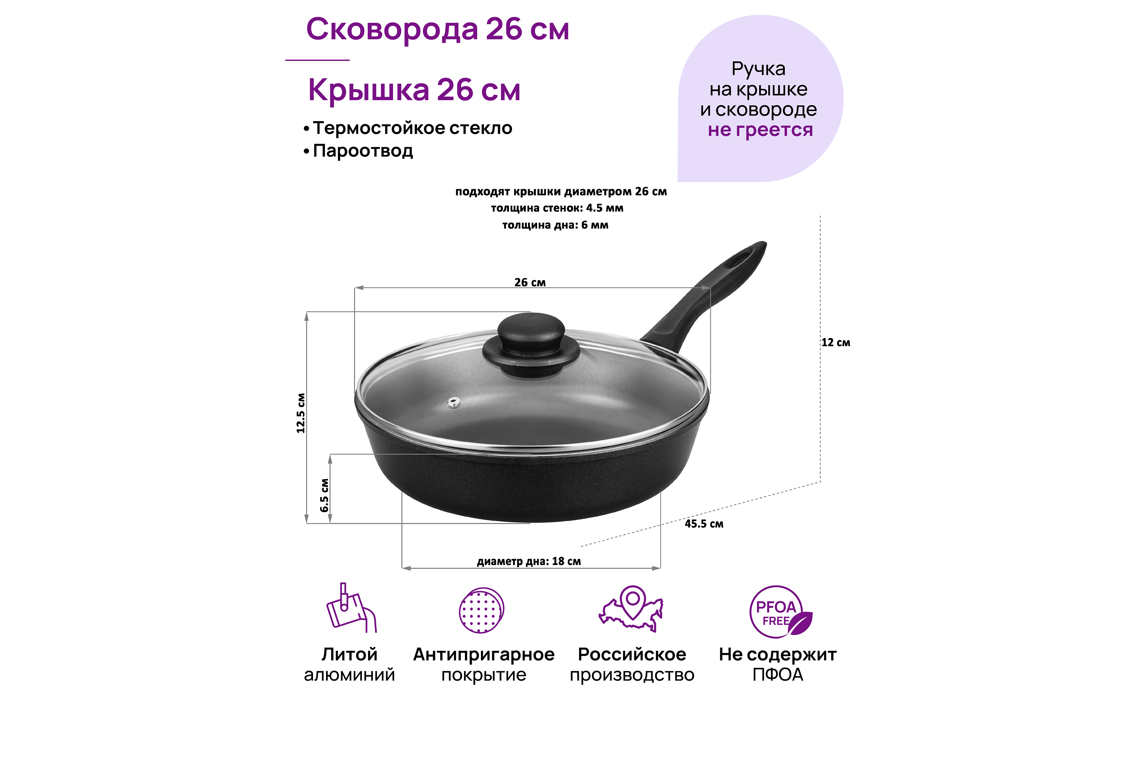 Сковорода глубокая "Гармония вкуса" 26 см с крышкой равномерно разогревается и распределяет тепло таким образом, что продукты в ней остаются сочными и сохраняют все свои полезные и вкусовые свойства. Сковорода выполнена из толстостенного литого алюминия и имеет ультрапрочное двухслойное антипригарное покрытие Cookmark. Покрытие устойчиво к царапинам и износу, полностью безопасно для здоровья и не содержит PFOA или других вредных веществ. Эксплуатация: не нагревать без продуктов. Дайте посуде остыть, прежде чем помещать ее в воду. Использовать только деревянные и силиконовые лопатки. Не мыть абразивными или щелочными моющими средствами. Использовать в посудомоечной машине только в режиме "Эко". Подходит для всех типов плит, кроме индукционных.