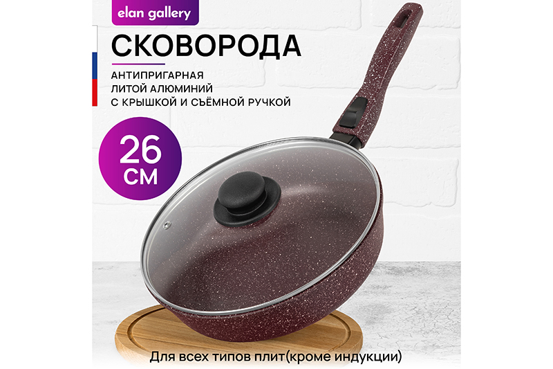 Глубокая сковорода Elan Gallery "Рубин" с крышкой и съёмной ручкой из серии "Гармония вкуса" диаметром 26 см равномерно разогревается и распределяет тепло, поэтому продукты в ней сохраняют полезные свойства и сочность. Диаметр дна — 18 см. Стильный дизайн подойдет к любому интерьеру кухни. Подходит для приготовления стейков из рыбы, мяса или блюд из овощей. Сковорода с глубоким дном выполнена из толстостенного литого алюминия и имеет ультрапрочное двухслойное антипригарное покрытие Cookmark. Оно устойчиво к царапинам и износу, безопасно для здоровья и не содержит PFOA или других вредных веществ. Используйте для жарки котлет или картофеля с минимальным количеством масла. Здоровую пищу оценит любой гурман! Готовьте на завтрак оладьи или блюда из яиц: яичницу, омлет. Порадуйте близких большой порцией блинов на Масленицу, ни один блинчик не подгорит. Алюминиевая сковородка с толстым дном имеет удобную ручку, которая обеспечивает надежный захват при подаче еды с плиты на стол. Без крышки и ручки можно использовать в духовом шкафу как форму для запекания при температуре до 250°C. Не использовать съёмную ручку, чтобы достать раскалённую сковороду из духовой печи! Приготовьте румяную курочку в духовке и порадуйте своих близких. Эксплуатация: не нагревать без продуктов. Дайте посуде остыть, прежде чем помещать ее в воду. Использовать только деревянные, силиконовые и пластиковые лопатки без острых краёв. Не мыть абразивными или щелочными моющими средствами. Использовать в ПММ в режиме "Эко" со средством, не содержащим щёлочи. Подходит для стеклокерамических, газовых и электрических плит. Не подходит для индукционных плит. Кухонная утварь станет приятным подарком для женщин на День Рождения, 8 Марта и придаст процессу приготовления пищи новый уровень комфорта. Подарите универсальную вещь маме, подруге, сестре или бабушке. Хорошая сковорода – мечта любой хозяйки! Сковородка станет незаменимым инвентарем на вашей кухне и наполнит процесс приготовления пищи удовольствием!
