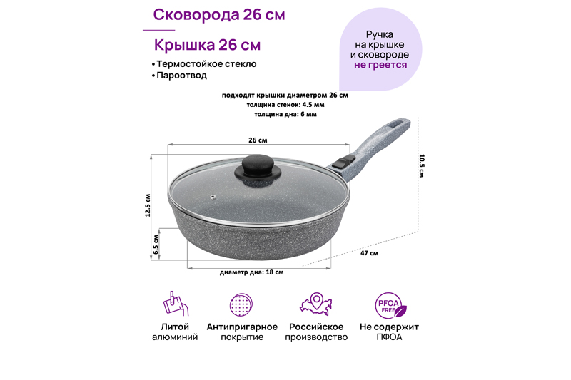 Сковорода глубокая 26 см ГАРМОНИЯ ВКУСА "Серый мрамор" С КРЫШКОЙ ф26, с/р, 47*27*12,5 см