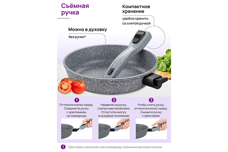 Глубокая сковорода Elan Gallery "Серый мрамор" с крышкой и съёмной ручкой из серии "Гармония вкуса" диаметром 26 см равномерно разогревается и распределяет тепло, поэтому продукты в ней сохраняют полезные свойства и сочность. Диаметр дна — 18 см. Стильный дизайн подойдет к любому интерьеру кухни. Подходит для приготовления стейков из рыбы, мяса или блюд из овощей. Сковорода с глубоким дном выполнена из толстостенного литого алюминия и имеет ультрапрочное двухслойное антипригарное покрытие Cookmark. Оно устойчиво к царапинам и износу, безопасно для здоровья и не содержит PFOA или других вредных веществ. Используйте для жарки котлет или картофеля с минимальным количеством масла. Здоровую пищу оценит любой гурман! Готовьте на завтрак оладьи или блюда из яиц: яичницу, омлет. Порадуйте близких большой порцией блинов на Масленицу, ни один блинчик не подгорит. Алюминиевая сковородка с толстым дном имеет удобную ручку, которая обеспечивает надежный захват при подаче еды с плиты на стол. Без крышки и ручки можно использовать в духовом шкафу как форму для запекания при температуре до 250°C. Не использовать съёмную ручку, чтобы достать раскалённую сковороду из духовой печи! Приготовьте румяную курочку в духовке и порадуйте своих близких. Эксплуатация: не нагревать без продуктов. Дайте посуде остыть, прежде чем помещать ее в воду. Использовать только деревянные, силиконовые и пластиковые лопатки без острых краёв. Не мыть абразивными или щелочными моющими средствами. Использовать в ПММ в режиме "Эко" со средством, не содержащим щёлочи. Подходит для стеклокерамических, газовых и электрических плит. Не подходит для индукционных плит. Кухонная утварь станет приятным подарком для женщин на День Рождения, 8 Марта и придаст процессу приготовления пищи комфорта. Подарите универсальную вещь маме, подруге, сестре или бабушке. Хорошая сковорода – мечта любой хозяйки! Сковородка станет незаменимым инвентарем на вашей кухне и наполнит процесс приготовления пищи удовольствием!