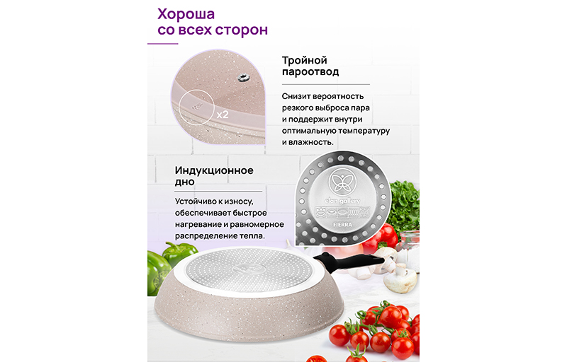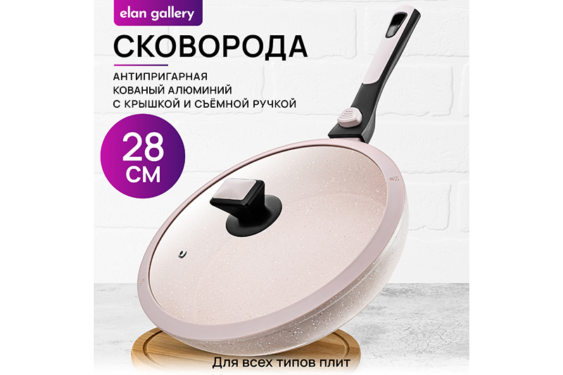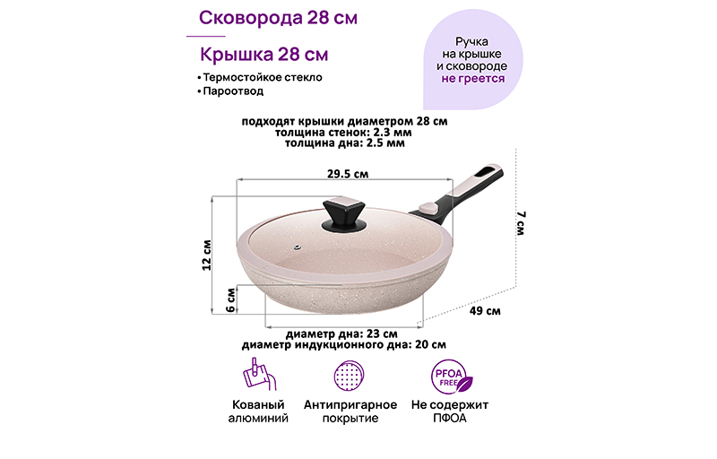 Сковорода глубокая 28 см FIERRA "Бежевый мрамор" С КРЫШКОЙ ф28, с/ручка, 49*29,5*12 см