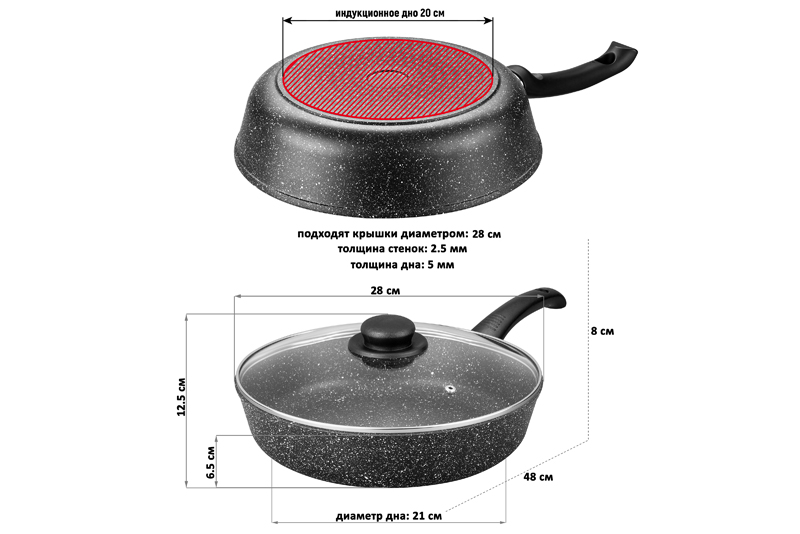 Сковорода глубокая "Гармония вкуса" 28 см со стеклянной крышкой равномерно разогревается и распределяет тепло таким образом, что продукты в ней остаются сочными и сохраняют все свои полезные и вкусовые свойства. Сковорода выполнена из литого алюминия, имеет высокие стенки, толстое индукционное дно и трехслойное антипригарное покрытие Duramax. Толстостенная посуда подойдет для приготовления самых разных блюд. На большой сковородке можно готовить стейки, ребрышки барбекю, овощи гриль, котлеты, блины и многие другие блюда. Сковорода универсальная: можно использовать как сотейник. Подходит для всех типов плит: газовых, стеклокерамических, индукции. Не подходит для духовки. Алюминиевая антипригарная сковорода - мечта любой хозяйки и оригинальный мужской подарок! Порадуйте любимого мужчину на День святого Валентина, 23 февраля, день рождения или Новый год. И пусть ваш парень или муж порадует вас в ответ вкусными блюдами!