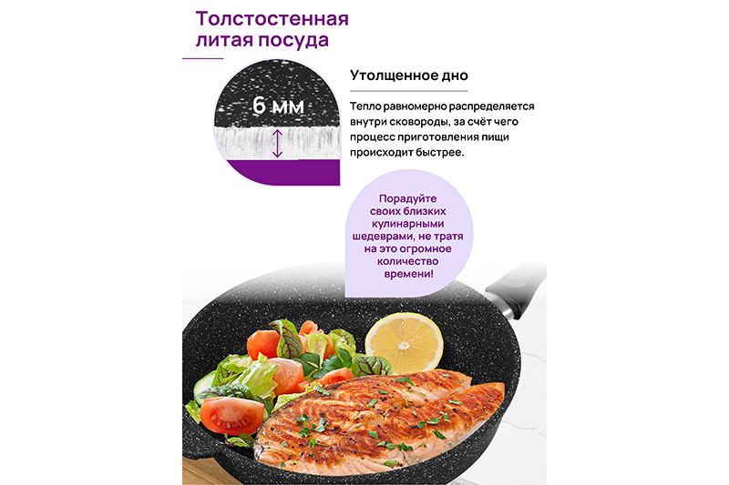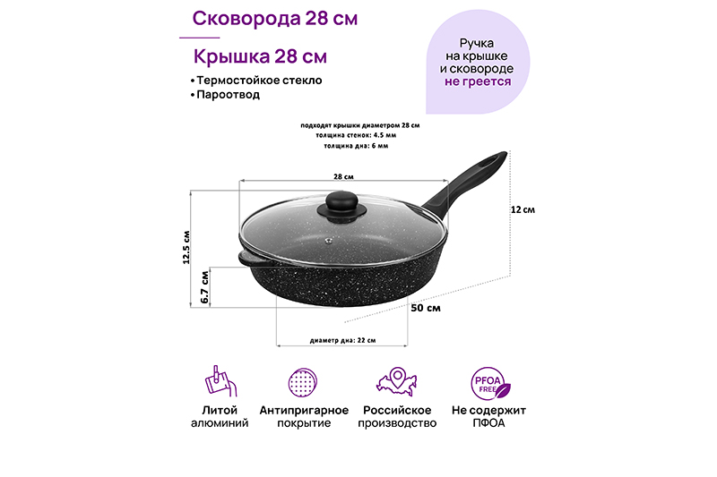 Глубокая сковорода Elan Gallery "Чёрный мрамор" с крышкой и несъёмной ручкой из серии "Гармония вкуса" диаметром 28 см равномерно разогревается и распределяет тепло, поэтому продукты в ней сохраняют полезные свойства и сочность. Диаметр дна — 22 см. Стильный дизайн подойдет к любому интерьеру кухни. Подходит для приготовления стейков из рыбы, мяса или блюд из овощей. Сковорода с глубоким дном выполнена из толстостенного литого алюминия и имеет ультрапрочное двухслойное антипригарное покрытие Cookmark. Оно устойчиво к царапинам и износу, безопасно для здоровья и не содержит PFOA или других вредных веществ. Используйте для жарки котлет или картофеля с минимальным количеством масла. Здоровую пищу оценит любой гурман! Готовьте на завтрак оладьи или блюда из яиц: яичницу, омлет. Порадуйте близких большой порцией блинов на Масленицу, ни один блинчик не подгорит. Алюминиевая сковородка с толстым дном имеет удобную ручку, которая обеспечивает надежный захват при подаче еды с плиты на стол. Эксплуатация: не нагревать без продуктов. Дайте посуде остыть, прежде чем помещать ее в воду. Использовать только деревянные, силиконовые и пластиковые лопатки без острых краёв. Не мыть абразивными или щелочными моющими средствами. Использовать в ПММ в режиме "Эко" со средством, не содержащим щёлочи. Подходит для стеклокерамических, газовых и электрических плит. Не подходит для индукционных плит. Кухонная утварь станет приятным подарком для женщин на День Рождения, 8 Марта и придаст процессу приготовления пищи новый уровень комфорта. Подарите универсальную вещь маме, подруге, сестре или бабушке. Хорошая сковорода – мечта любой хозяйки! Готовьте с радостью и любовью, создавая вкусные блюда для себя и своих гостей. Сковородка станет незаменимым инвентарем на вашей кухне и наполнит процесс приготовления пищи удовольствием!